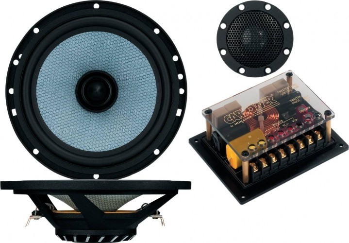 | Тип на високоговорителитеКоаксиални високоговорители: Коаксиалните високоговорители се характеризират с конструкция, наречена всичко в едно. Високочестотният и среднобасовият говорител са в един и същ кош. Предимството е по-лесен монтаж, но поради свързването или близостта на честотните диапазони в един говорител обикновено се понижава качеството на звука. Обикновено в центъра на среднобасовия говорител се намира високочестотният говорител, чиито звукова бобина работи във втората въздушна междина на общия магнитен кръг. Коаксиален говорител с три честотни диапазона се състои от среднобасов говорител, отпред на специален носач е поставен средночестотният говорител и отделен високочестотен. Компонентни високоговорители: Компонентните високоговорители се отличават с разделянето на отделни честотни диапазони: високочестотен + среднобасов + евентуално басов диапазон. Отделните говорители могат да бъдат разположени напълно отделно, което води до по-добро звуково и акустично представяне. В огромното мнозинство от случаите при компонентните високоговорители се доставя и външна кросоувърна мрежа, която разделя високите, средните/среднобасовите и при системи с три честотни диапазона и басовите честоти, както и позволява настройване на нивото в децибели на високочестотния говорител (напр. +2 dB, 0 dB, -2 dB), стръмността (напр. 6 dB/октава, 12 dB/октава) или активно/bi-amp свързване. | компонентна 2-посочна |