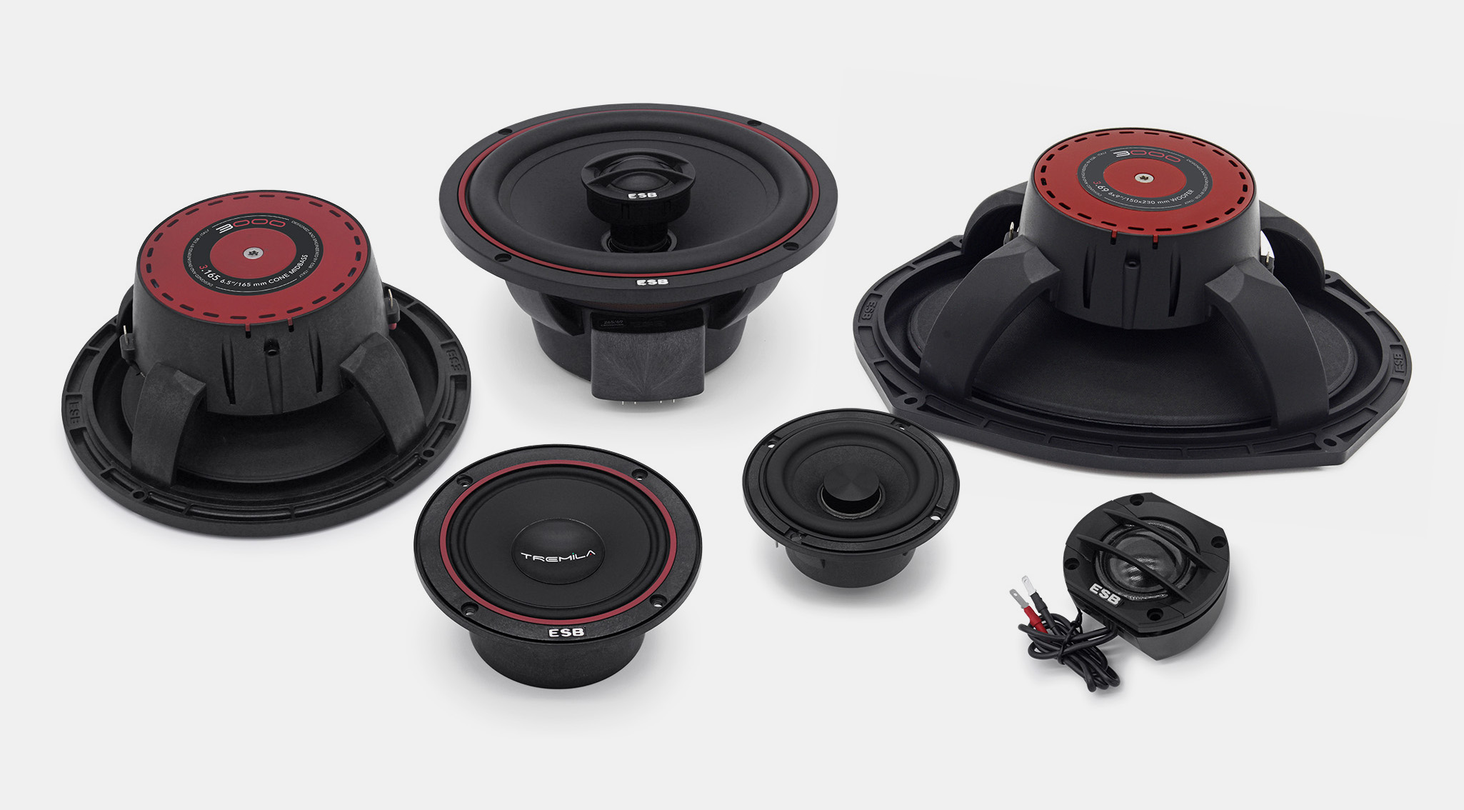 Системата говорители ESB от серия 3000 (Tremila) беше разработена и сглобена с голям ангажимент в областта на изследването на материали и технически решения от най-високо ниво. Целта беше да се създаде пълна гама говорители и субуфъри, фокусирани върху високо качество на звука и универсална инсталация. Кошовете на говорителите са проектирани за постигане на максимална торсионна твърдост. Диафрагмата от пресована хартия с водоустойчива обработка е най-доброто съчетание на лекота, твърдост и способност на диафрагмата да заглушава евентуални нежелани вибрации. Всички средночестотни/бас говорители са оборудвани с мотор с феритен магнит клас Y-35, с значително по-висока мощност от класическите „standardní“ феритни магнити. Високочестотните говорители са изработени от тънка платнена мембрана, импрегнирана с коприна за много фин и природен звук. Бобината разполага с отлично вентилиране с антирезонансни камери и е заглушена със специално масло на базата на течно желязо. Говорителите се доставят с аксесоари за гъвкава инсталация. Това е комплект без честотни филтри (които е възможно да се закупят) предназначен за активно свързване към усилвател и DSP процесор. В този комплект ще намерите средночестотен и широколентов говорител, който замества класическия високочестотен говорител.