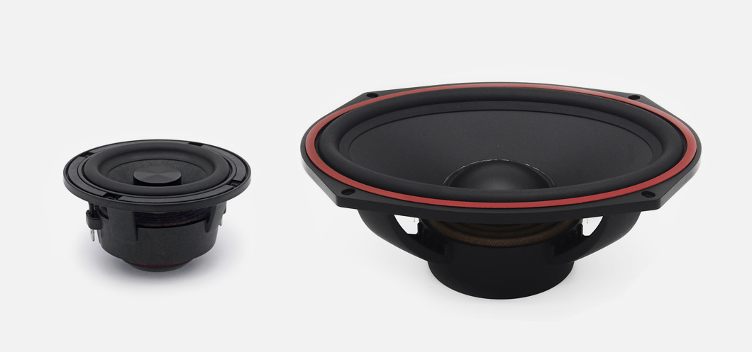 | Тип на високоговорителитеКоаксиални високоговорители: Коаксиалните високоговорители се характеризират с конструкция, наречена всичко в едно. Високочестотният и среднобасовият говорител са в един и същ кош. Предимството е по-лесен монтаж, но поради свързването или близостта на честотните диапазони в един говорител обикновено се понижава качеството на звука. Обикновено в центъра на среднобасовия говорител се намира високочестотният говорител, чиито звукова бобина работи във втората въздушна междина на общия магнитен кръг. Коаксиален говорител с три честотни диапазона се състои от среднобасов говорител, отпред на специален носач е поставен средночестотният говорител и отделен високочестотен. Компонентни високоговорители: Компонентните високоговорители се отличават с разделянето на отделни честотни диапазони: високочестотен + среднобасов + евентуално басов диапазон. Отделните говорители могат да бъдат разположени напълно отделно, което води до по-добро звуково и акустично представяне. В огромното мнозинство от случаите при компонентните високоговорители се доставя и външна кросоувърна мрежа, която разделя високите, средните/среднобасовите и при системи с три честотни диапазона и басовите честоти, както и позволява настройване на нивото в децибели на високочестотния говорител (напр. +2 dB, 0 dB, -2 dB), стръмността (напр. 6 dB/октава, 12 dB/октава) или активно/bi-amp свързване. | Компонентни 2-лентови |