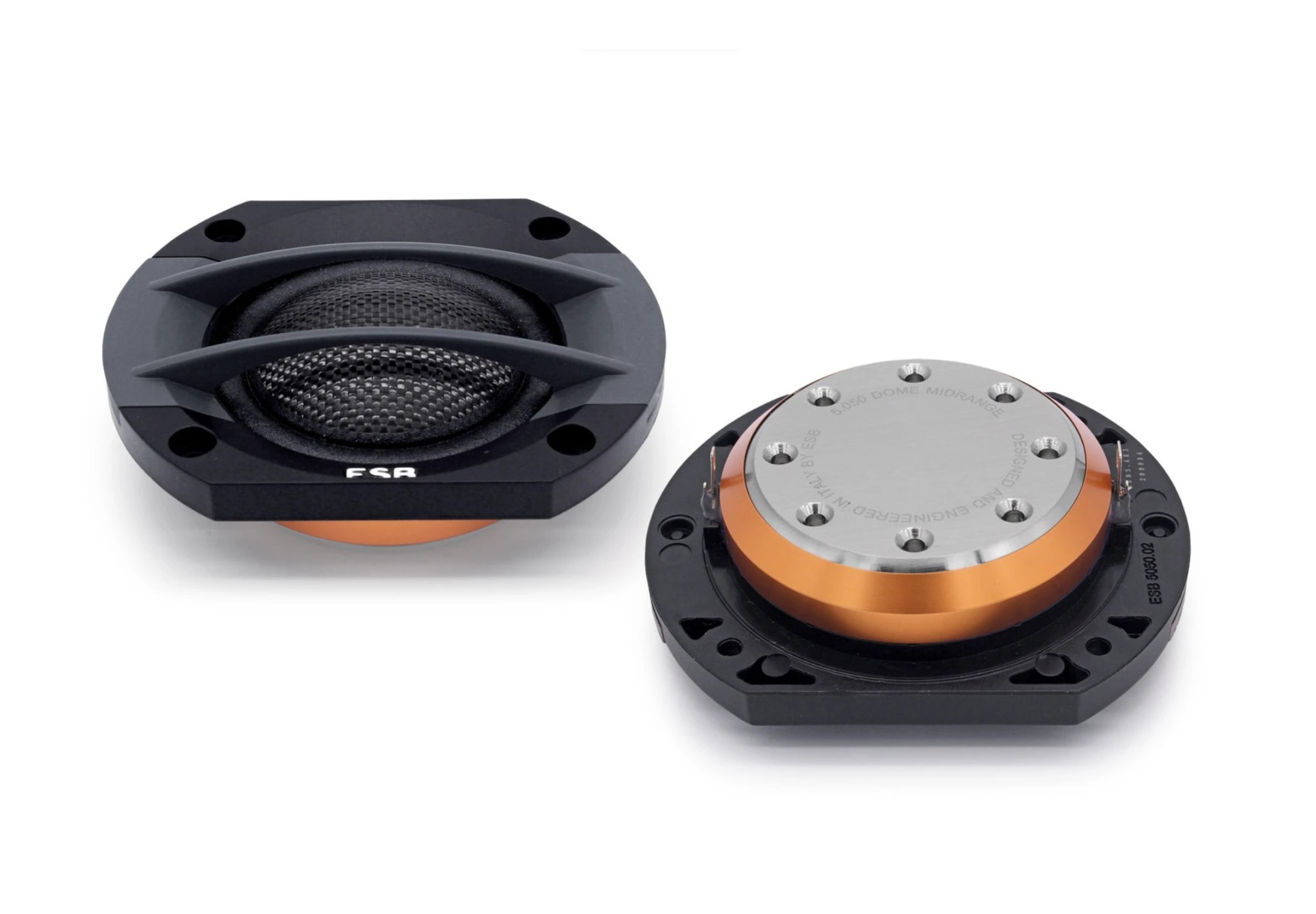 Мембраната на високочестотните и средните говорители, както и тази на средночестотните, е изработена от композитен материал PMC, който е допълнително подсилен с въглеродни влакна. Това гарантира отлична твърдост и същевременно много ниско тегло на мембраната. Високочестотният говорител използва много голям, вентилиран неодимов магнит, който е оптимизиран чрез компютърни симулации (FEA) за постигане на по-голяма ефективност и подобрена линейност при всички отклонения на подвижната бобина. Неодимовият магнит от най-високо качество намалява магнитните загуби при повишена температура и концентрира повече енергия в малко пространство. Кошът на високочестотния и средния говорител също впечатлява със своя атрактивен дизайн и, между другото, с голямото си тегло. Това се дължи на използването на благородни метални материали, произведени чрез CNC процес. Голямо внимание е отделено на осевата и радиалната вентилация на подвижната бобина, за да се осигури работа при висока мощност, намалено изкривяване и удължен живот. Осеовите вентилационни отвори намаляват компресията на въздуха в задната част на мембраната с значително намалено изкривяване и удължена реакция към по-ниски честоти. Алуминиевата подвижна бобина с размер 28 mm при високочестотния говорител, съответно 50 mm при средния говорител, позволява използването на много висока мощност за този тип компоненти. Макар кошът на говорителите да превъзхожда с антирезонансните си свойства, остатъчните резонанси са допълнително потиснати с демпфиращ материал dB Cloth® под куполата, което разширява честотната реакция към долните граници и намалява хармоничното изкривяване.