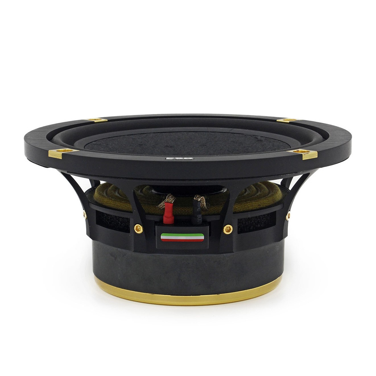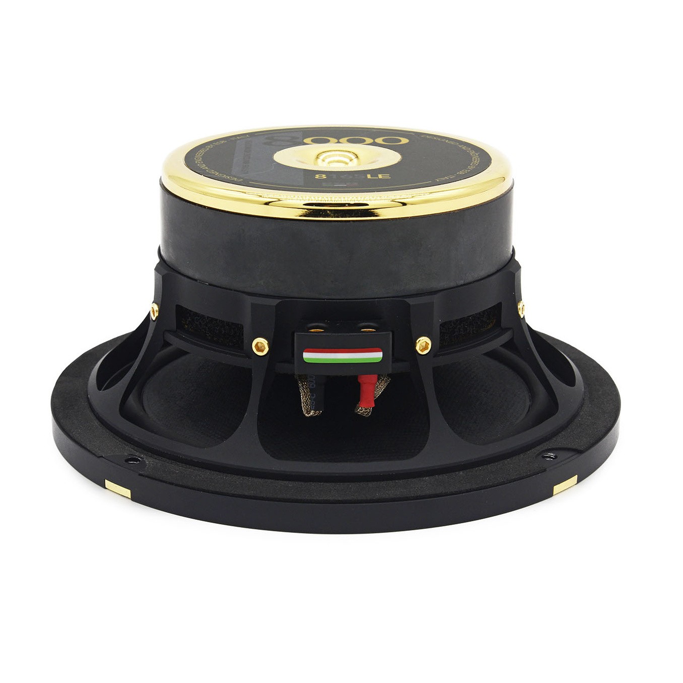 Може би първото, което ще забележите незабавно, е изключителният външен вид и изработка на средночестотните говорители. Кошът, изработен от алуминиева сплав, е напълно обработен с числово управление CNC. Благодарение на това структурата на коша е много твърда и с практически нулеви допуски в полза на консистентното изпълнение и максималната предавка на енергия от говорната бобина към мембраната. Това води до повишена ефективност в ниския диапазон и липса на резонанси в средния и високия диапазон. Мембраната от ненатисната хартиа, както и прахообразният прахообразен капак, представляват най-добрия компромис между демпфиране и твърдост за изключително естествен звук без оцветяване или промени. Водоотблъскващото покритие също е подходящо за приложения в сурова среда. Големият и висококачествен навит магнит (Y-35) гарантира излишък от енергия, благодарение на който върховите отклонения са лесно възпроизвеждаеми от басовия говорител. Дори при големи отклонения бобината работи тихо и винаги в рамките на своето магнитно поле. Внимателно проучване, подплатено с FEM анализ, позволи да се проектират металните части на магнита така, че да се максимизира потокът точно около движещата се бобина и да остане линеен през целия ход. Вентилацията се осигурява чрез голям отвор в долната част, където формата му намалява шума от евентуални турбуленции до несъмнено ниско ниво. Говорната бобина с голям диаметър използва алуминиева опора за по-добро разсейване на топлината. Освен това цялата говорна бобина е изложена на външен въздух през големи процепи в коша (защитени с прахообразна гъба). В говорителите от серия 8000 всеки детайл играе важна роля и затова ESB се съсредоточиха и върху ексклузивна дизайнерска клема, която приема кабели с голям сеч.