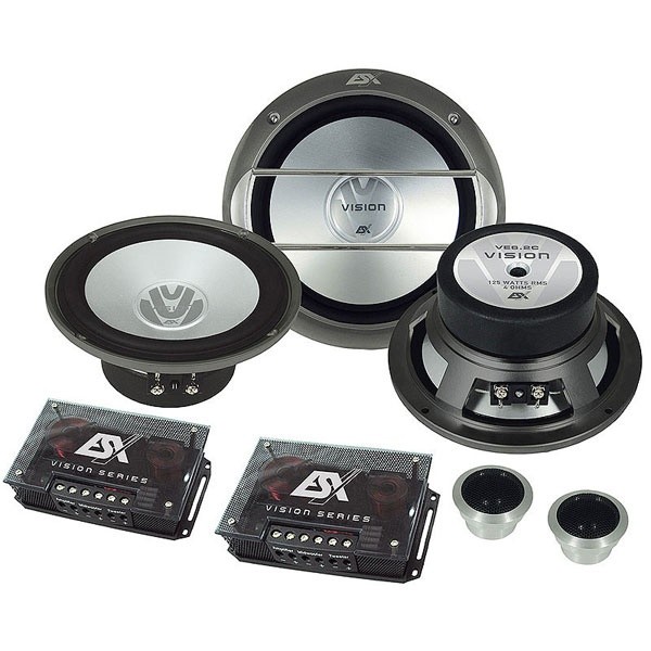 | Тип на високоговорителитеКоаксиални високоговорители: Коаксиалните високоговорители се характеризират с конструкция, наречена всичко в едно. Високочестотният и среднобасовият говорител са в един и същ кош. Предимството е по-лесен монтаж, но поради свързването или близостта на честотните диапазони в един говорител обикновено се понижава качеството на звука. Обикновено в центъра на среднобасовия говорител се намира високочестотният говорител, чиито звукова бобина работи във втората въздушна междина на общия магнитен кръг. Коаксиален говорител с три честотни диапазона се състои от среднобасов говорител, отпред на специален носач е поставен средночестотният говорител и отделен високочестотен. Компонентни високоговорители: Компонентните високоговорители се отличават с разделянето на отделни честотни диапазони: високочестотен + среднобасов + евентуално басов диапазон. Отделните говорители могат да бъдат разположени напълно отделно, което води до по-добро звуково и акустично представяне. В огромното мнозинство от случаите при компонентните високоговорители се доставя и външна кросоувърна мрежа, която разделя високите, средните/среднобасовите и при системи с три честотни диапазона и басовите честоти, както и позволява настройване на нивото в децибели на високочестотния говорител (напр. +2 dB, 0 dB, -2 dB), стръмността (напр. 6 dB/октава, 12 dB/октава) или активно/bi-amp свързване. | компонентни 2-лентови |