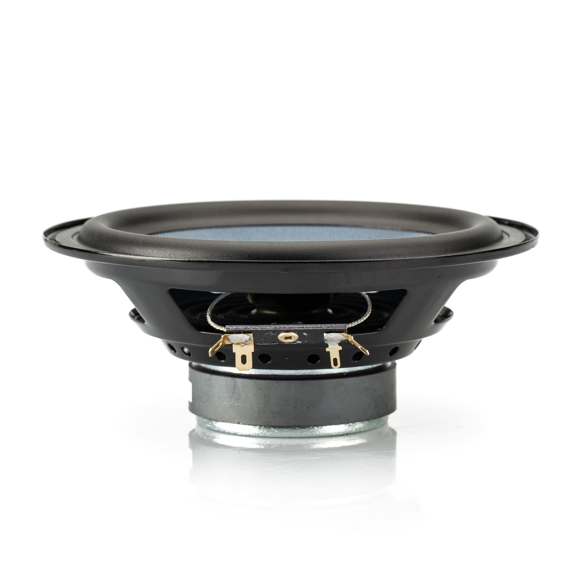 | Тип на високоговорителитеКоаксиални високоговорители: Коаксиалните високоговорители се характеризират с конструкция, наречена всичко в едно. Високочестотният и среднобасовият говорител са в един и същ кош. Предимството е по-лесен монтаж, но поради свързването или близостта на честотните диапазони в един говорител обикновено се понижава качеството на звука. Обикновено в центъра на среднобасовия говорител се намира високочестотният говорител, чиито звукова бобина работи във втората въздушна междина на общия магнитен кръг. Коаксиален говорител с три честотни диапазона се състои от среднобасов говорител, отпред на специален носач е поставен средночестотният говорител и отделен високочестотен. Компонентни високоговорители: Компонентните високоговорители се отличават с разделянето на отделни честотни диапазони: високочестотен + среднобасов + евентуално басов диапазон. Отделните говорители могат да бъдат разположени напълно отделно, което води до по-добро звуково и акустично представяне. В огромното мнозинство от случаите при компонентните високоговорители се доставя и външна кросоувърна мрежа, която разделя високите, средните/среднобасовите и при системи с три честотни диапазона и басовите честоти, както и позволява настройване на нивото в децибели на високочестотния говорител (напр. +2 dB, 0 dB, -2 dB), стръмността (напр. 6 dB/октава, 12 dB/октава) или активно/bi-amp свързване. | Компонентни двулентови |