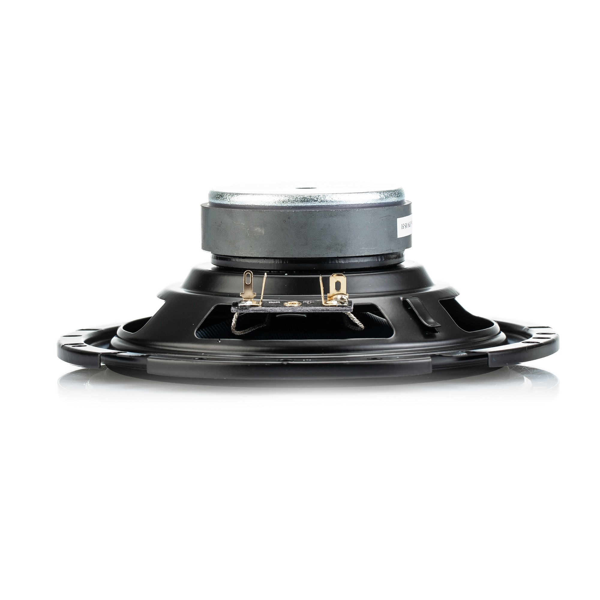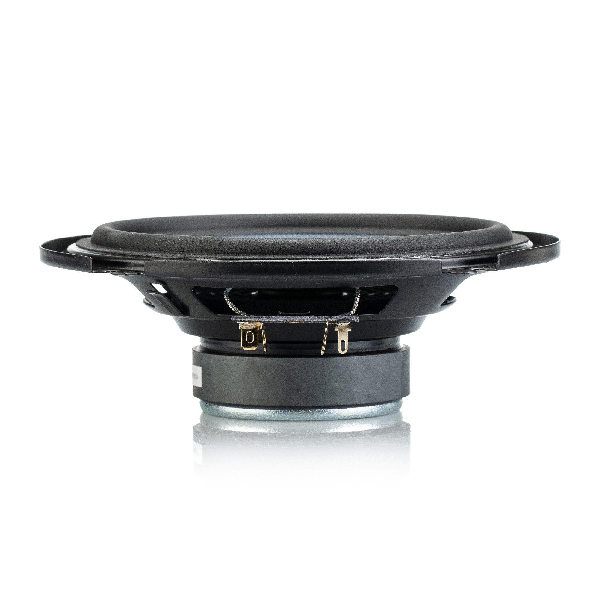| Тип на високоговорителитеКоаксиални високоговорители: Коаксиалните високоговорители се характеризират с конструкция, наречена всичко в едно. Високочестотният и среднобасовият говорител са в един и същ кош. Предимството е по-лесен монтаж, но поради свързването или близостта на честотните диапазони в един говорител обикновено се понижава качеството на звука. Обикновено в центъра на среднобасовия говорител се намира високочестотният говорител, чиито звукова бобина работи във втората въздушна междина на общия магнитен кръг. Коаксиален говорител с три честотни диапазона се състои от среднобасов говорител, отпред на специален носач е поставен средночестотният говорител и отделен високочестотен. Компонентни високоговорители: Компонентните високоговорители се отличават с разделянето на отделни честотни диапазони: високочестотен + среднобасов + евентуално басов диапазон. Отделните говорители могат да бъдат разположени напълно отделно, което води до по-добро звуково и акустично представяне. В огромното мнозинство от случаите при компонентните високоговорители се доставя и външна кросоувърна мрежа, която разделя високите, средните/среднобасовите и при системи с три честотни диапазона и басовите честоти, както и позволява настройване на нивото в децибели на високочестотния говорител (напр. +2 dB, 0 dB, -2 dB), стръмността (напр. 6 dB/октава, 12 dB/октава) или активно/bi-amp свързване. | Компонентни двулентови |