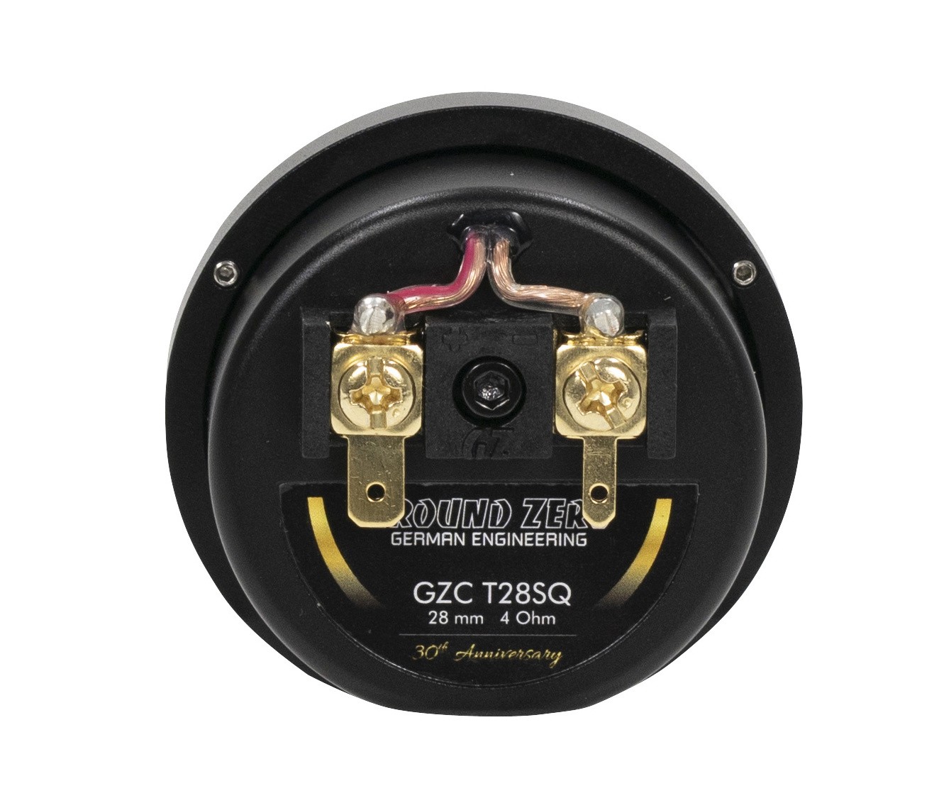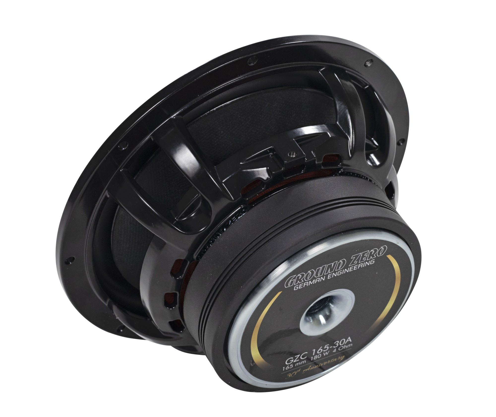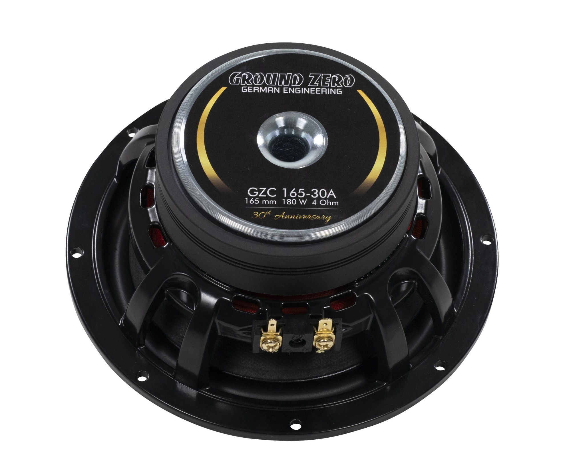 Компонентната система Ground Zero GZC 165-30A от лимитирана серия по случай 30-годишнината на Ground Zero навлиза в доказаната серия Hydrogen, но с редица модификации и подобрения. Благодарение на комбинацията от здрав средночестотен говорител и пищялка, заета от по-високата серия Nuclear, тази система предлага много балансиран звук с висока разделителна способност и динамика. Дизайнът на изданието 30A се отличава с ексклузивна черно-златна повърхностна обработка и червен центриращ спайдър, който подсказва използването на по-модерно окачване, разработвано чрез симулационен софтуер и измервания Klippel®. Басовият говорител с 165 mm мембрана от нелепена хартия използва голяма 38 mm гласова бобина, здрав феритов магнит и прецизно оформени полюсни плочи, което осигурява достатъчен резерв от мощност и издръжливост при дълготрайно натоварване. Пищялката с 28 mm копринен куполен диафрагмен елемент дава мек и детайлен звук дори в по-ниските честотни диапазони, където обикновените пищялки вече не се справят. Кросоувърът е проектиран по класически начин с наклон 6 dB за уфъфера и 12 dB за пищялката, допълнен с качествени компоненти и възможност за избор на нивото на пищялката или фина настройка на средния диапазон.