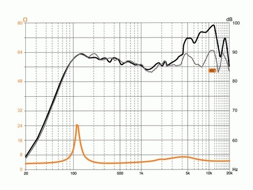 | Čувствителност (2,83V/1m)Чувствителност, сензитивност или ефективност на говорителя. Чувствителността на говорителите се посочва в децибели (dB) и накратко означава, че колкото по-висока е стойността, толкова по-малки са изискванията към мощността на усилвателя. Това всъщност е оценка за това как говорителят преобразува ватове в звук. Оценката на чувствителността е нивото на шума, измерено на 1 метър от говорителя при използване на 1 W (ват) или при подаване на 2,83 волта на източника на 1 метър. По-високото децибелово ниво означава, че говорителят е по-громък при по-ниска мощност. За всеки ръст от 3 dB чувствителността, говорителят изисква половината мощност за възпроизвеждане на същото ниво на звука. Например, ако говорител с 88 dB изисква 100 вата за постигане на определено ниво на звука, то говорител с 91 dB чувствителност изисква само 50 вата, за да достигне същото ниво. | 90 dB |