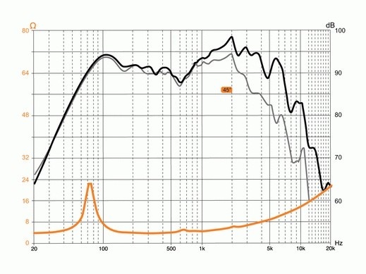 | Čувствителност (2,83V/1m)Чувствителност, сензитивност или ефективност на говорителя. Чувствителността на говорителите се посочва в децибели (dB) и накратко означава, че колкото по-висока е стойността, толкова по-малки са изискванията към мощността на усилвателя. Това всъщност е оценка за това как говорителят преобразува ватове в звук. Оценката на чувствителността е нивото на шума, измерено на 1 метър от говорителя при използване на 1 W (ват) или при подаване на 2,83 волта на източника на 1 метър. По-високото децибелово ниво означава, че говорителят е по-громък при по-ниска мощност. За всеки ръст от 3 dB чувствителността, говорителят изисква половината мощност за възпроизвеждане на същото ниво на звука. Например, ако говорител с 88 dB изисква 100 вата за постигане на определено ниво на звука, то говорител с 91 dB чувствителност изисква само 50 вата, за да достигне същото ниво. | 93,5 dB |