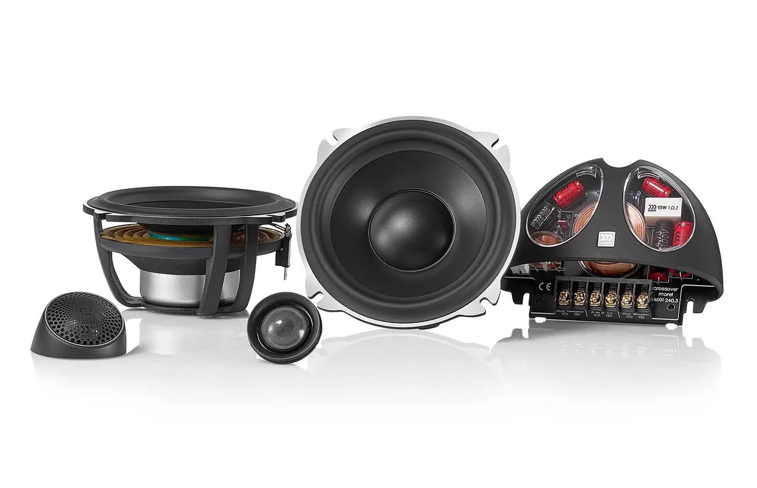 | Тип на високоговорителитеКоаксиални високоговорители: Коаксиалните високоговорители се характеризират с конструкция, наречена всичко в едно. Високочестотният и среднобасовият говорител са в един и същ кош. Предимството е по-лесен монтаж, но поради свързването или близостта на честотните диапазони в един говорител обикновено се понижава качеството на звука. Обикновено в центъра на среднобасовия говорител се намира високочестотният говорител, чиито звукова бобина работи във втората въздушна междина на общия магнитен кръг. Коаксиален говорител с три честотни диапазона се състои от среднобасов говорител, отпред на специален носач е поставен средночестотният говорител и отделен високочестотен. Компонентни високоговорители: Компонентните високоговорители се отличават с разделянето на отделни честотни диапазони: високочестотен + среднобасов + евентуално басов диапазон. Отделните говорители могат да бъдат разположени напълно отделно, което води до по-добро звуково и акустично представяне. В огромното мнозинство от случаите при компонентните високоговорители се доставя и външна кросоувърна мрежа, която разделя високите, средните/среднобасовите и при системи с три честотни диапазона и басовите честоти, както и позволява настройване на нивото в децибели на високочестотния говорител (напр. +2 dB, 0 dB, -2 dB), стръмността (напр. 6 dB/октава, 12 dB/октава) или активно/bi-amp свързване. | Компонентни двулентови |