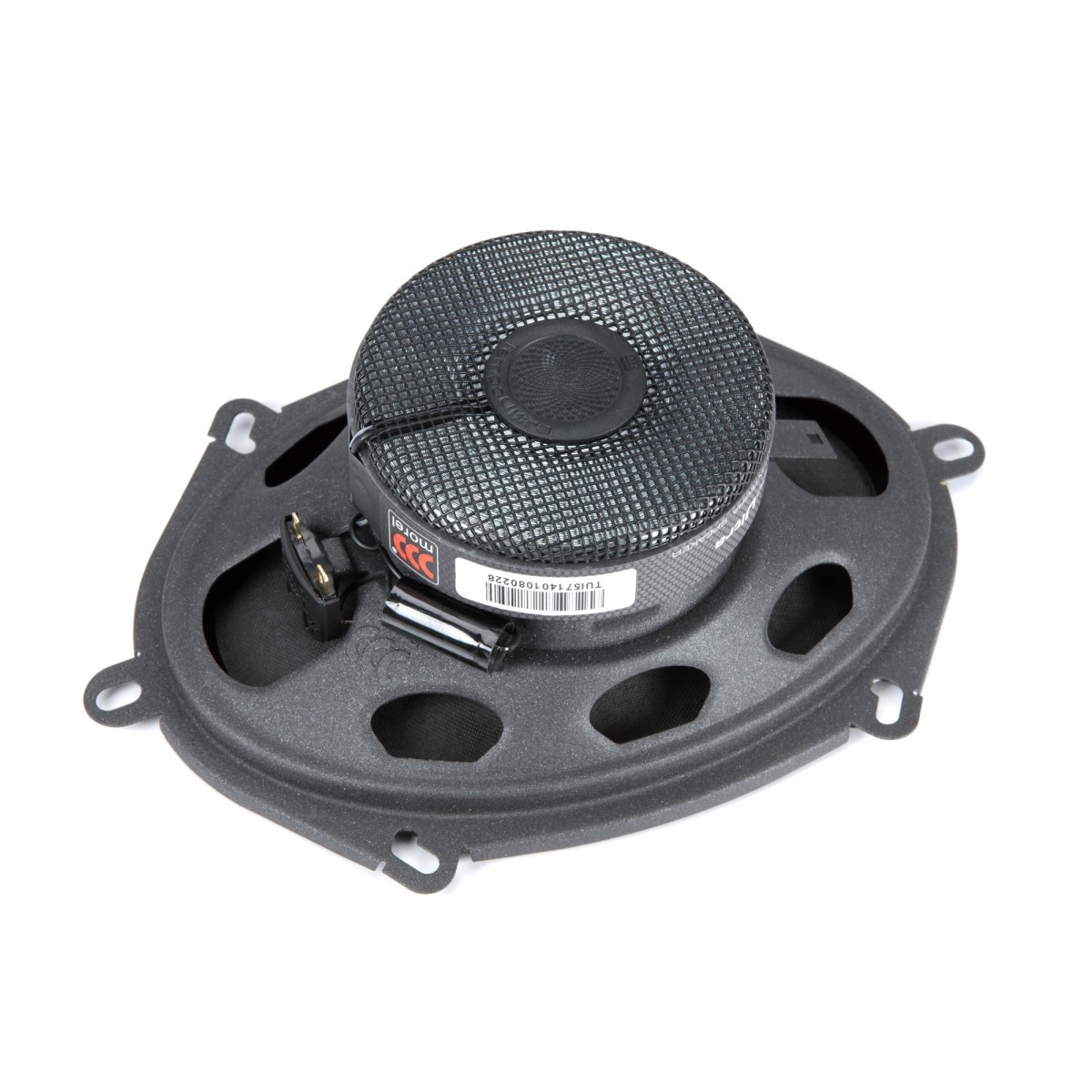 | Тип на високоговорителитеКоаксиални високоговорители: Коаксиалните високоговорители се характеризират с конструкция, наречена всичко в едно. Високочестотният и среднобасовият говорител са в един и същ кош. Предимството е по-лесен монтаж, но поради свързването или близостта на честотните диапазони в един говорител обикновено се понижава качеството на звука. Обикновено в центъра на среднобасовия говорител се намира високочестотният говорител, чиито звукова бобина работи във втората въздушна междина на общия магнитен кръг. Коаксиален говорител с три честотни диапазона се състои от среднобасов говорител, отпред на специален носач е поставен средночестотният говорител и отделен високочестотен. Компонентни високоговорители: Компонентните високоговорители се отличават с разделянето на отделни честотни диапазони: високочестотен + среднобасов + евентуално басов диапазон. Отделните говорители могат да бъдат разположени напълно отделно, което води до по-добро звуково и акустично представяне. В огромното мнозинство от случаите при компонентните високоговорители се доставя и външна кросоувърна мрежа, която разделя високите, средните/среднобасовите и при системи с три честотни диапазона и басовите честоти, както и позволява настройване на нивото в децибели на високочестотния говорител (напр. +2 dB, 0 dB, -2 dB), стръмността (напр. 6 dB/октава, 12 dB/октава) или активно/bi-amp свързване. | Коаксиални двулентови |