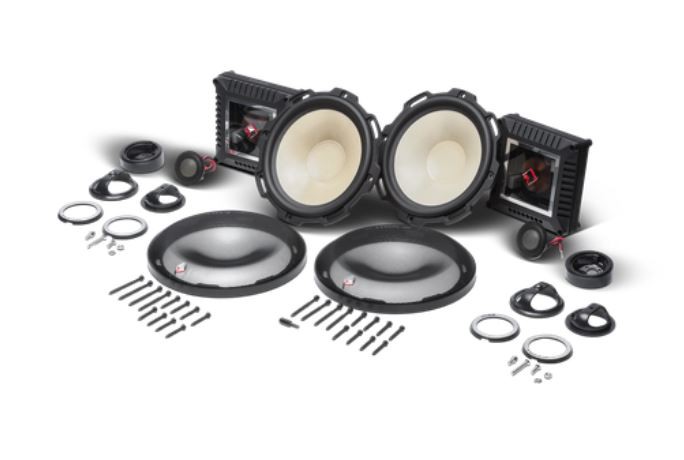 | Тип на високоговорителитеКоаксиални високоговорители: Коаксиалните високоговорители се характеризират с конструкция, наречена всичко в едно. Високочестотният и среднобасовият говорител са в един и същ кош. Предимството е по-лесен монтаж, но поради свързването или близостта на честотните диапазони в един говорител обикновено се понижава качеството на звука. Обикновено в центъра на среднобасовия говорител се намира високочестотният говорител, чиито звукова бобина работи във втората въздушна междина на общия магнитен кръг. Коаксиален говорител с три честотни диапазона се състои от среднобасов говорител, отпред на специален носач е поставен средночестотният говорител и отделен високочестотен. Компонентни високоговорители: Компонентните високоговорители се отличават с разделянето на отделни честотни диапазони: високочестотен + среднобасов + евентуално басов диапазон. Отделните говорители могат да бъдат разположени напълно отделно, което води до по-добро звуково и акустично представяне. В огромното мнозинство от случаите при компонентните високоговорители се доставя и външна кросоувърна мрежа, която разделя високите, средните/среднобасовите и при системи с три честотни диапазона и басовите честоти, както и позволява настройване на нивото в децибели на високочестотния говорител (напр. +2 dB, 0 dB, -2 dB), стръмността (напр. 6 dB/октава, 12 dB/октава) или активно/bi-amp свързване. | Компонентни 2-посочни |