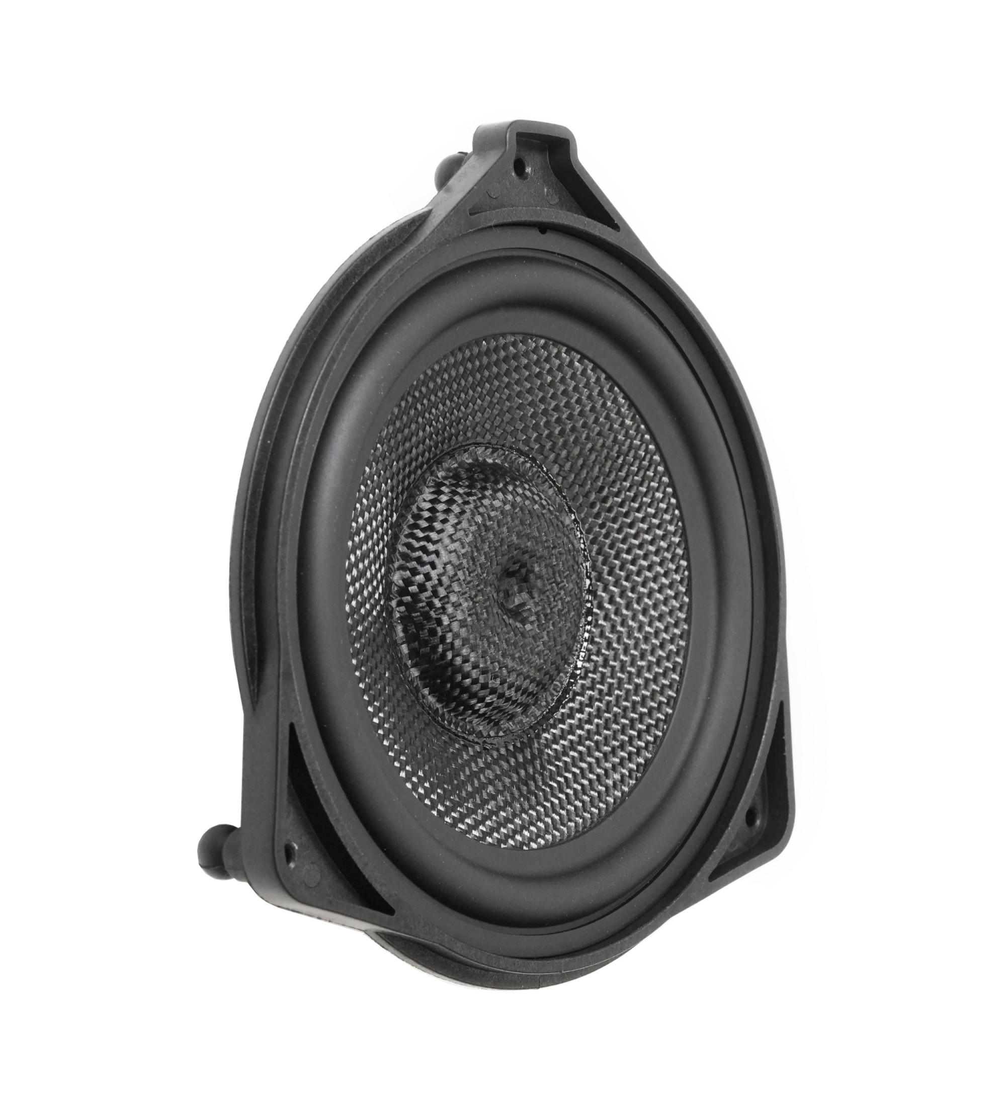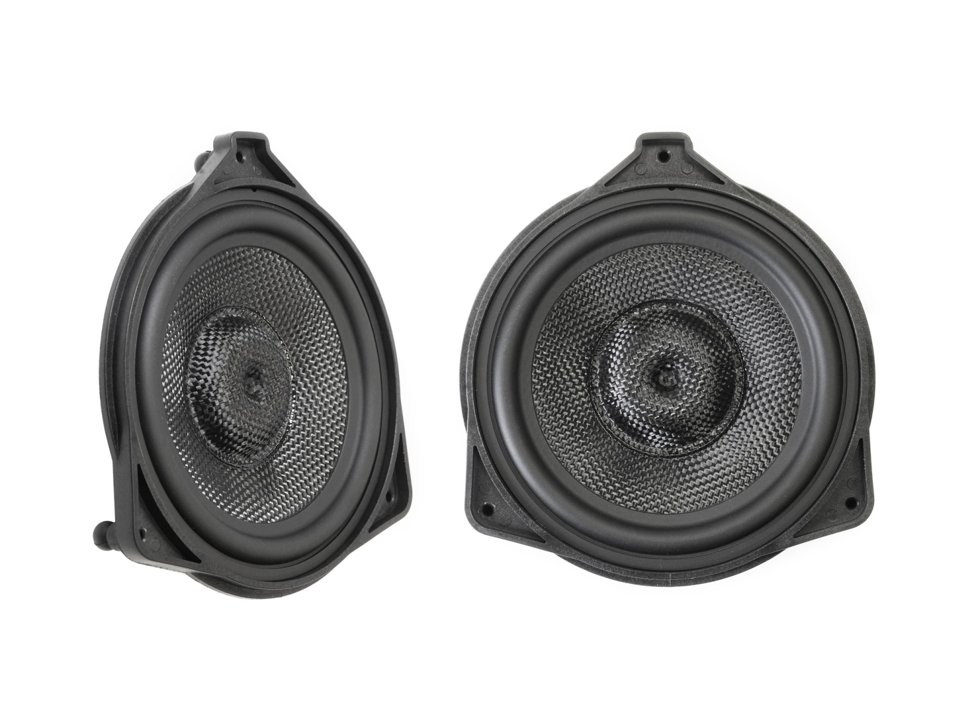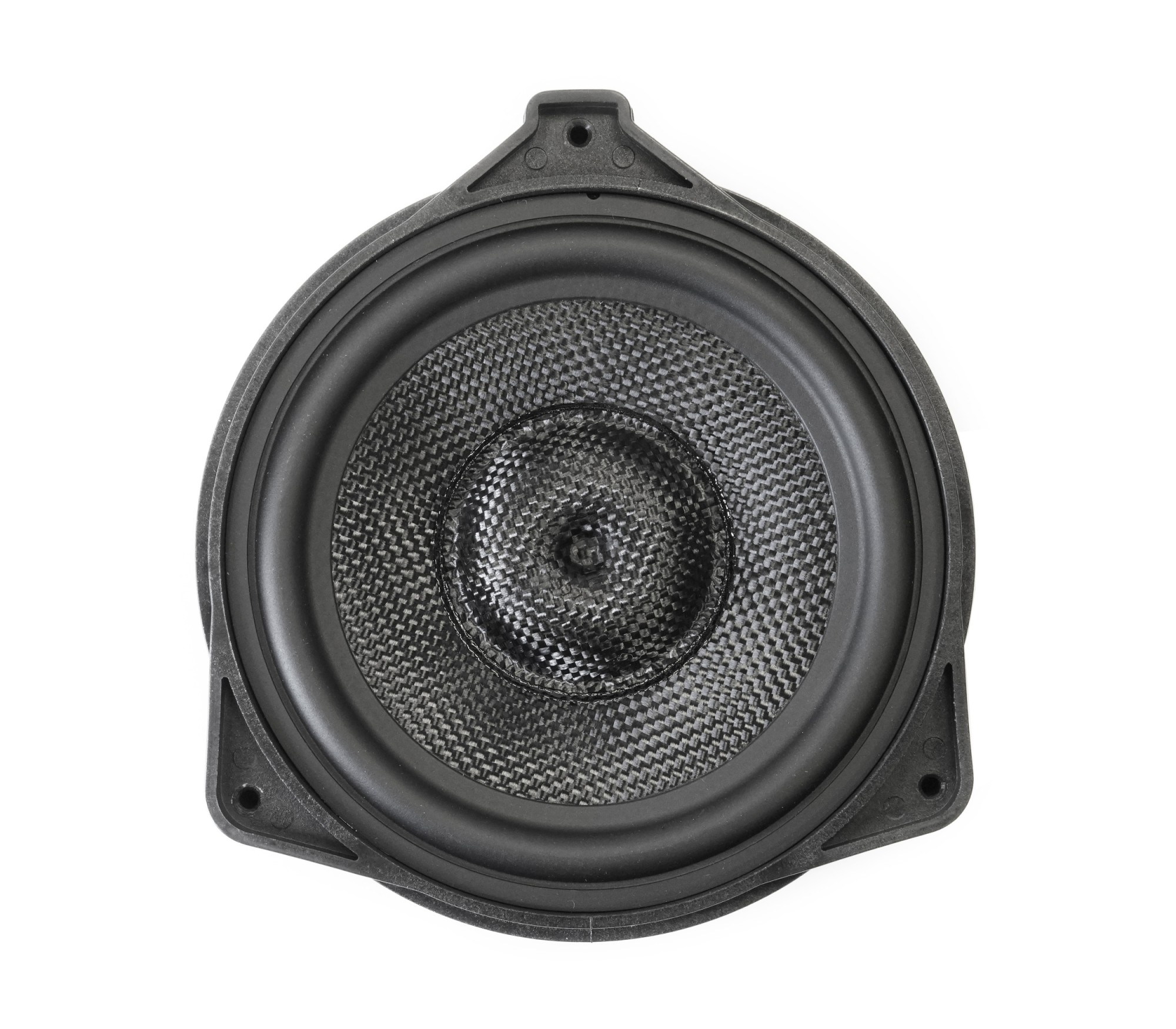 | Тип на високоговорителитеКоаксиални високоговорители: Коаксиалните високоговорители се характеризират с конструкция, наречена всичко в едно. Високочестотният и среднобасовият говорител са в един и същ кош. Предимството е по-лесен монтаж, но поради свързването или близостта на честотните диапазони в един говорител обикновено се понижава качеството на звука. Обикновено в центъра на среднобасовия говорител се намира високочестотният говорител, чиито звукова бобина работи във втората въздушна междина на общия магнитен кръг. Коаксиален говорител с три честотни диапазона се състои от среднобасов говорител, отпред на специален носач е поставен средночестотният говорител и отделен високочестотен. Компонентни високоговорители: Компонентните високоговорители се отличават с разделянето на отделни честотни диапазони: високочестотен + среднобасов + евентуално басов диапазон. Отделните говорители могат да бъдат разположени напълно отделно, което води до по-добро звуково и акустично представяне. В огромното мнозинство от случаите при компонентните високоговорители се доставя и външна кросоувърна мрежа, която разделя високите, средните/среднобасовите и при системи с три честотни диапазона и басовите честоти, както и позволява настройване на нивото в децибели на високочестотния говорител (напр. +2 dB, 0 dB, -2 dB), стръмността (напр. 6 dB/октава, 12 dB/октава) или активно/bi-amp свързване. | Средночестотни |