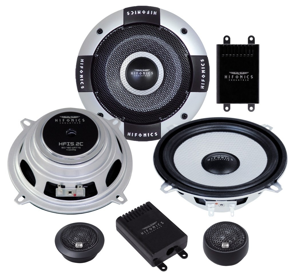 | Тип на високоговорителитеКоаксиални високоговорители: Коаксиалните високоговорители се характеризират с конструкция, наречена всичко в едно. Високочестотният и среднобасовият говорител са в един и същ кош. Предимството е по-лесен монтаж, но поради свързването или близостта на честотните диапазони в един говорител обикновено се понижава качеството на звука. Обикновено в центъра на среднобасовия говорител се намира високочестотният говорител, чиито звукова бобина работи във втората въздушна междина на общия магнитен кръг. Коаксиален говорител с три честотни диапазона се състои от среднобасов говорител, отпред на специален носач е поставен средночестотният говорител и отделен високочестотен. Компонентни високоговорители: Компонентните високоговорители се отличават с разделянето на отделни честотни диапазони: високочестотен + среднобасов + евентуално басов диапазон. Отделните говорители могат да бъдат разположени напълно отделно, което води до по-добро звуково и акустично представяне. В огромното мнозинство от случаите при компонентните високоговорители се доставя и външна кросоувърна мрежа, която разделя високите, средните/среднобасовите и при системи с три честотни диапазона и басовите честоти, както и позволява настройване на нивото в децибели на високочестотния говорител (напр. +2 dB, 0 dB, -2 dB), стръмността (напр. 6 dB/октава, 12 dB/октава) или активно/bi-amp свързване. | компонентни 2-полосни |