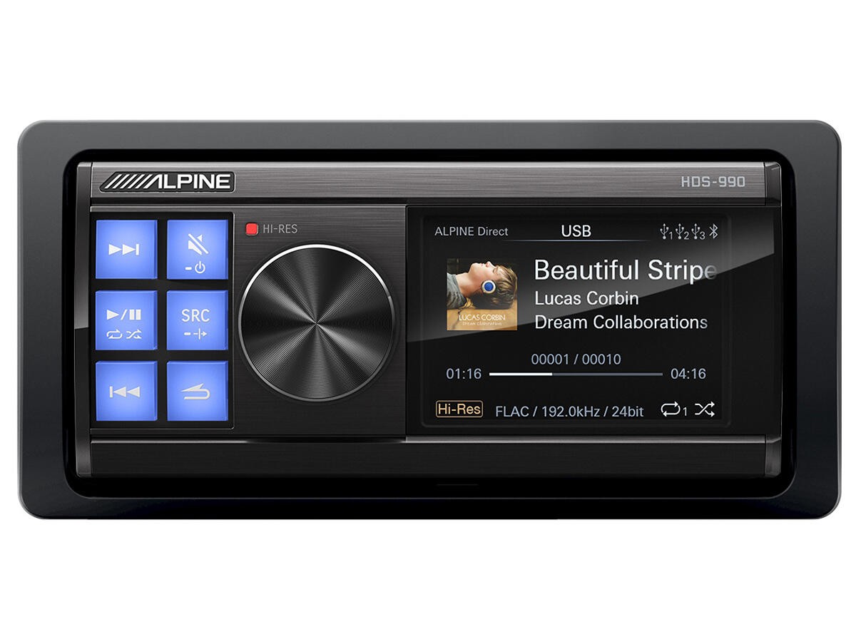 - Hi-Res Audio Media Player - HDS-990 Alpine Status Media Player звучи просто удивително и може да възпроизвежда Hi-Res Audio файлове до 192 kHz / 24 бита без пресемплиране. Поддържа множество аудио формати като MP3, WMA, AAC, MP4, WAV, FLAC, APE и DSD. Аудио източниците могат да се свържат към 3 USB порта или да се стриймват чрез Bluetooth (с по-ниска честота на семплиране).