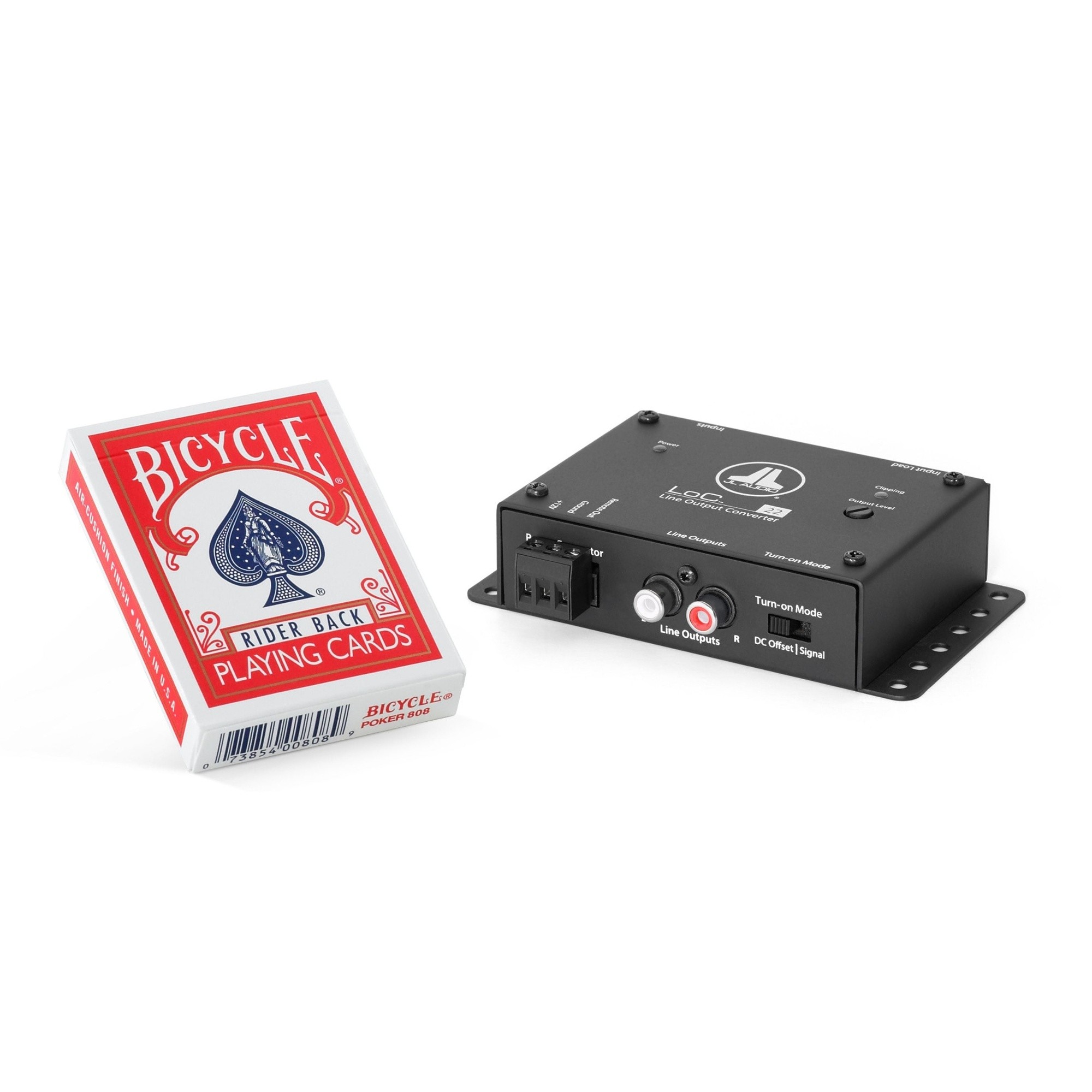 Напълно активен двуканален преобразувател от ниво на говорители към линейни изходи с автоматично включване. LoC-22, проектиран от старшия инженер на JL Audio Bruce Macmillan, е активен двуканален процесор за приложения, които изискват намаляване на фабричните аудио сигнали за използване с допълнителни усилватели и сигнали процесори. LoC-22 използва напълно регулиран превключващ MOSFET захранващ източник и дизайн на напълно аналогов кръг, за да осигури плосък честотен отговор при всяко ниво на сигнала (3 Hz – 32 kHz, +0, -1 dB), без да променя отговора на басите при високи нива, както е често при пасивните преобразуватели за линейни изходи. LoC-22 е проектиран за потискане на индуцирания шум по кабела и разполага с диференциално балансирана входна архитектура, която го прави съвместим практически с всеки аналогов аудио сигнал. LoC-22 може да приеме до 40 V RMS на канал (еквивалент на 400 W @ 4 ома) и лесно управлява най-мощните фабрични усилвателни изходи. Вграден превключвател за входно натоварване с два диапазона осигурява съвместимост с повечето фабрични усилватели, които използват измерване на импеданс за заглушаване на канали. LoC-22 е снабден с чифт аналогови RCA линейни изходни жакове (до 8V RMS) за подаване на аудио сигнали към вашата допълнителна система. Аналоговите изходи са съвместими с повечето марки следпродажбени сигнални процесори или усилватели. Настройката на изходното ниво е изключително лесна благодарение на специално калибриран вграден индикатор за клип, който работи с тестови тонове или музика. LoC-22 предлага два метода за автоматично включване (DC-Offset Sensing или Signal Sensing) и предоставя положителен 12V сигнал за включване за активиране на допълнителни усилватели или друга следваща електроника.