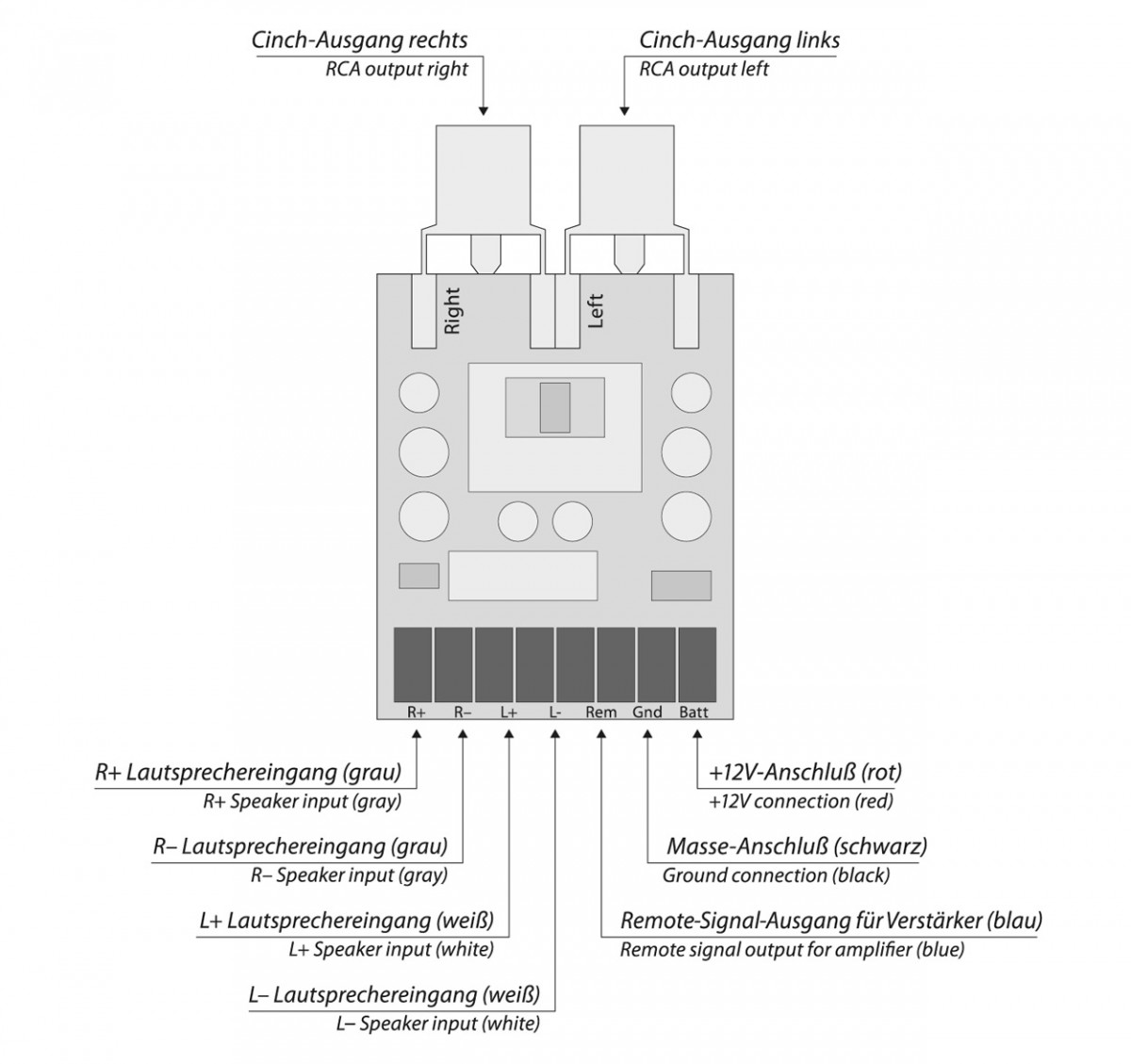 Ако вашето автомобилно радио няма предусилвателен изход, а все пак искате да свържете външен усилвател, този преобразувател осигурява лесно свързване. 2-канален преобразувател генерира сигнал от високоговорителните изходи на радиото и подава сигнал за включване на свързания усилвател. Идеално решение например при използване на оригиналното радио.