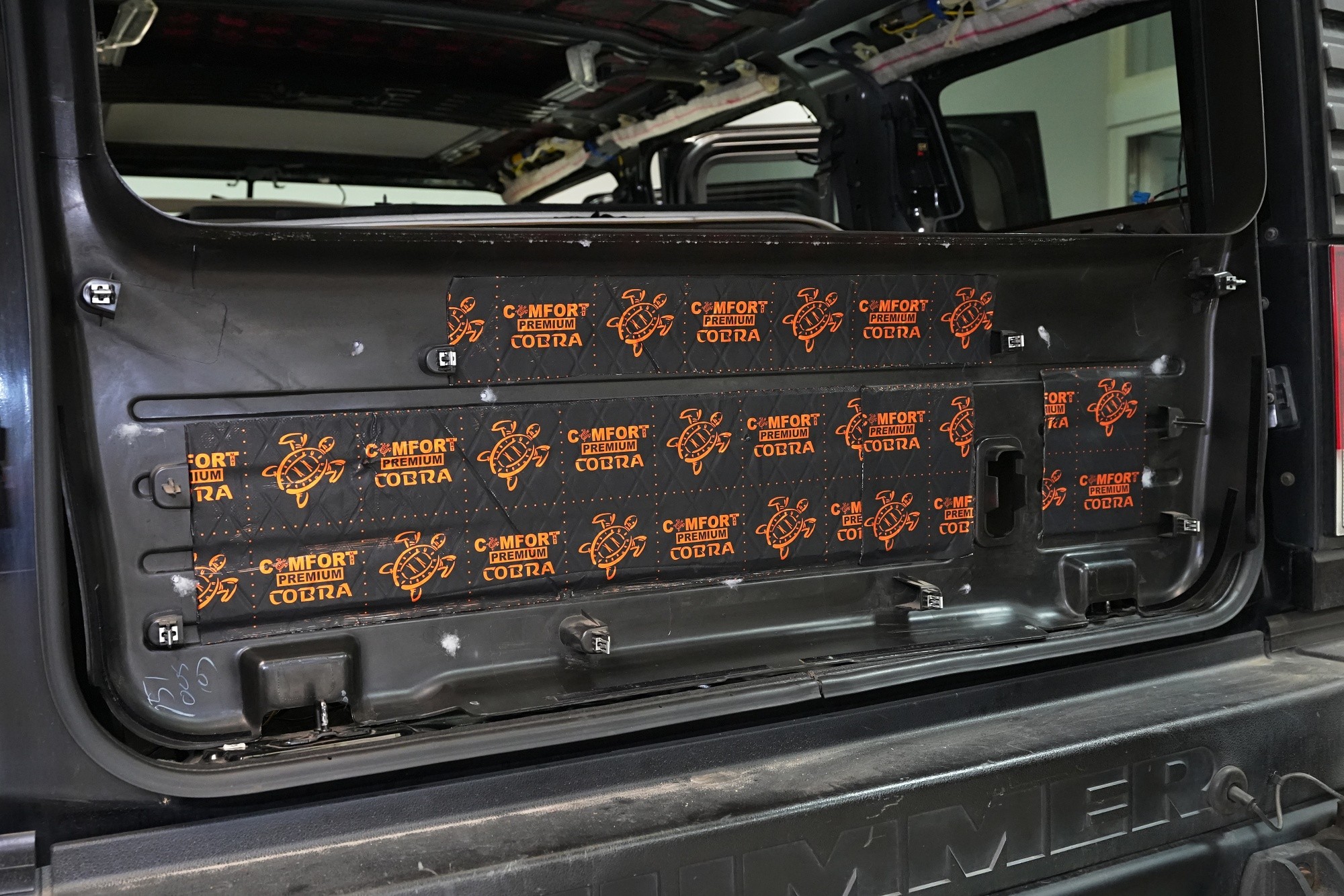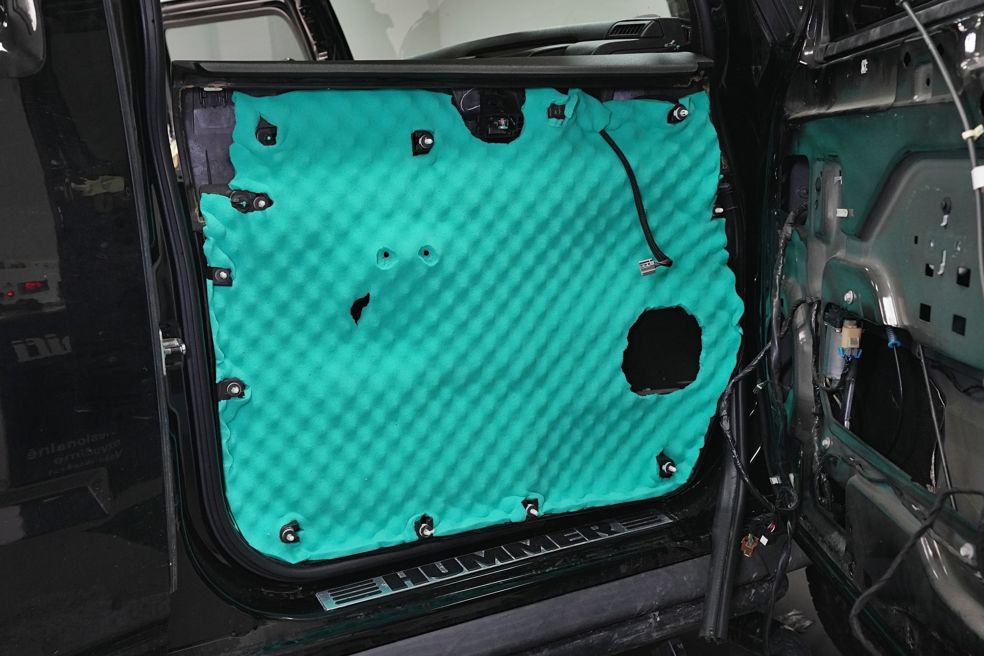 Пълно шумоизолиране на автомобил Hummer H2, включително демонтаж и шумоизолиране на таблото. Hummer H2 е цивилна версия на първоначално военен автомобил, който благодарение на своите специфични характеристики стана особено популярен в САЩ. Сред най-големите недостатъци на автомобила са високото ниво на шум в купето и сериозен проблем представлява неприятното скърцане на почти всички интериорни пластмаси, което се проявява при преминаване през неравности. Hummer няма никаква заводска шумоизолация и под тънкия слой килим се вижда чиста ламарина. От автомобил с такъв двигател, шумни спортни ауспуси и огромни гуми не може да се очаква нищо друго освен сериозен шум в купето. Задачата беше ясна - да премахнем максимално възможно присъщия шум в този автомобил. Избрахме нашия пакет Expert Plus с някои модификации за още по-голяма ефективност. Нетрадиционно използвахме за цялата подова част и задната част на автомобила по два слоя Comfortmat Extreme и Titan, които в тези дебелини са най-ефективните материали на настоящия пазар. Конкретно шумоизолирахме предните, задните и петите врати, пода, багажното пространство, предните и задните вътрешни калници, покрива, капака на двигателя и обърнахме специално внимание на таблото. Всички важни области на автомобила са шумоизолирани с модерни двуслойни материали и в резултат са приложени четири слоя шумоизолация с различни свойства. По шумоизолирането работеха петима наши техници, които изпълниха монтажа в рамките на 2 работни дни. Повече информация ще намерите в нашия подробен фоторепортаж.