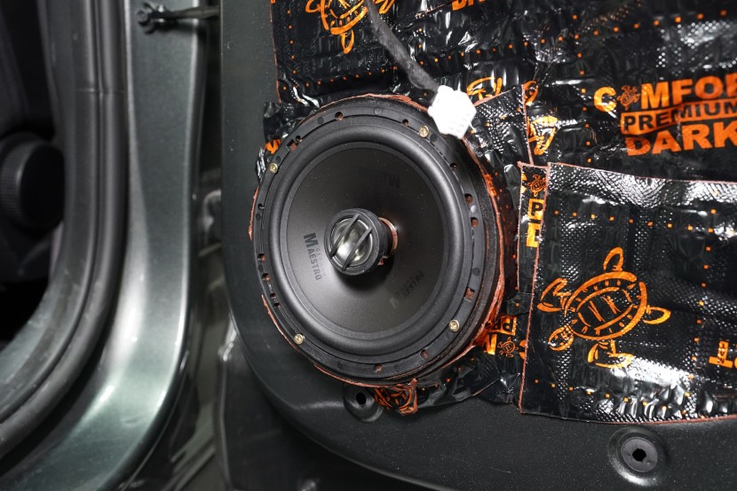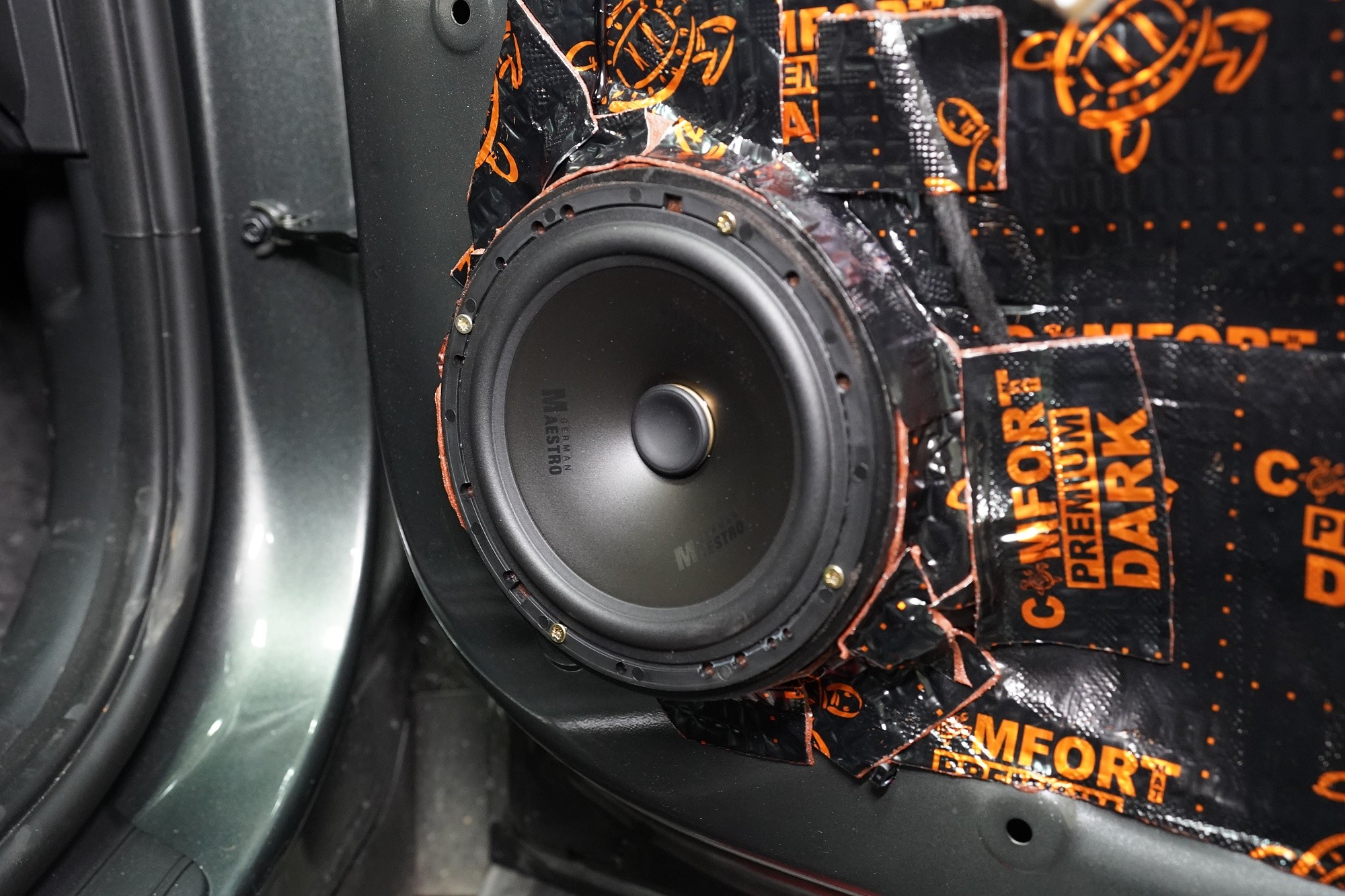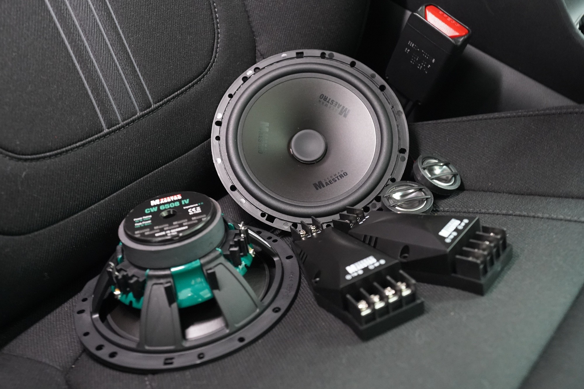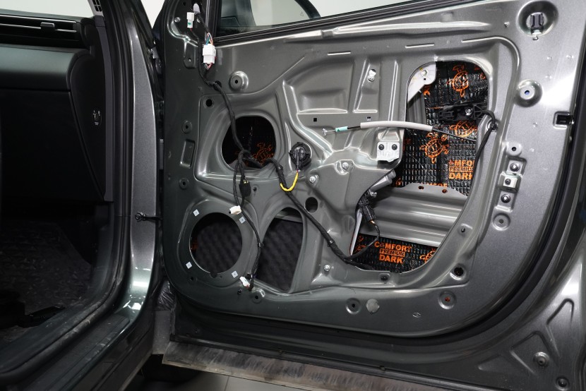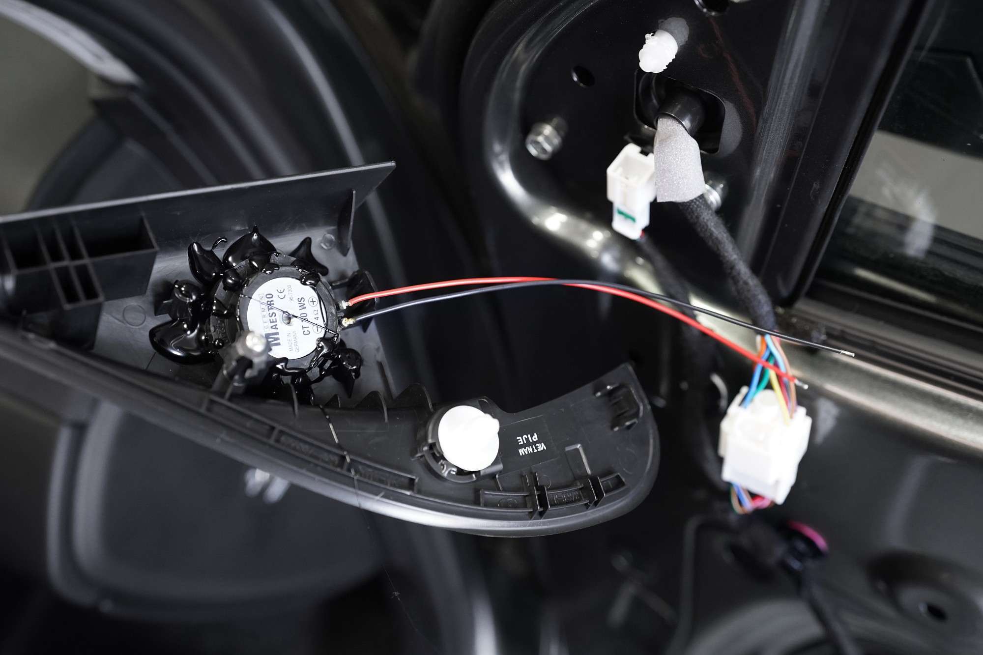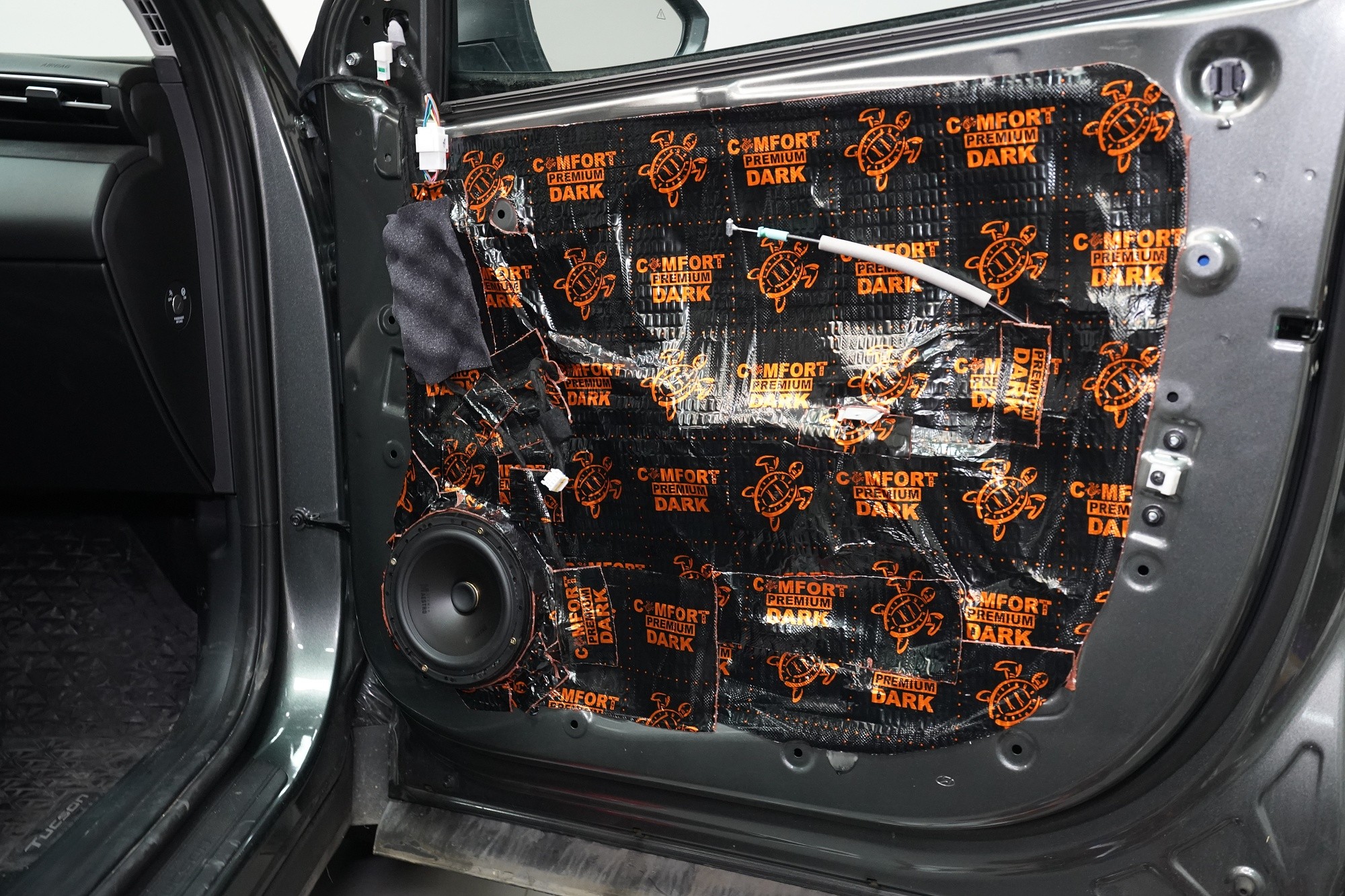 Смяна на високоговорителите в автомобил Hyundai Tucson от най-новото поколение. Най-простото и също най-икономично решение за подобряване на звука на заводската озвучителна система е смяната на високоговорителите при запазване на заводската автомагнитола. За това е необходимо да се изберат високоговорители с оптимална мощност и висока чувствителност, които позволяват свързване към заводска автомагнитола с по-ниска мощност. Нашият клиент, при прослушване на демопанела в магазина, избра комплект високоговорители на немския производител German Maestro, които все още се произвеждат ръчно в Германия. Въпреки че хартиените параметри на тези високоговорители не впечатляват, реалността е съвсем друга и въпреки посочената чувствителност под 90 dB, високоговорителите с лекота се справят с мощността на заводската автомагнитола. Всички врати естествено бяха шумоизолирани с премиум материали Comfortmat, което ще гарантира особено подсилване на басовия компонент на среднобасите и подобряване на техния звук. Изключително ниското тегло на антивибрационния материал Comfortmat Premium Dark позволява безпроблемна работа с вратите и в бъдеще.