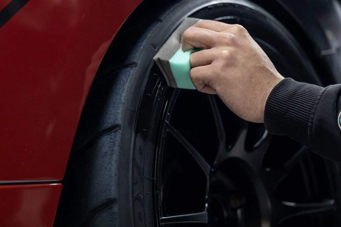- Нанесете няколко капки от препарата на пянен апликатор и разнесете по повърхността на гумата, след това оставете да узрее за около 5 минути.
