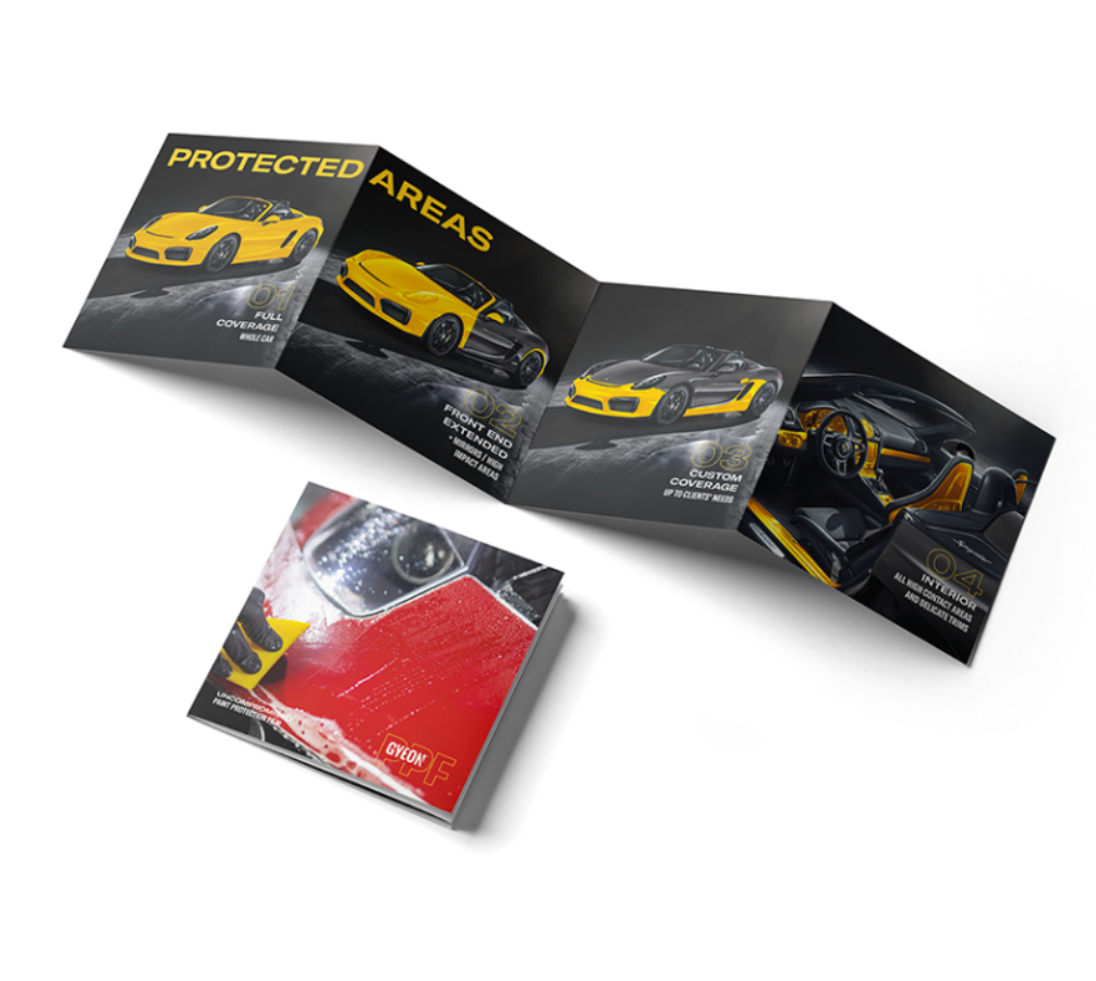 Тази брошура е създадена, за да обясни на клиентите просто и ясно какво включва инсталирането на Paint Protection Film (PPF) и какви предимства носи за дългосрочната защита на автомобила. Съдържа обзор на основните характеристики на PPF, разликите между отделните типове фолиа и ползите от професионална инсталация под бранда GYEON. Модерната графика, изчистеното оформление и качественият печат я правят привлекателен и професионален презентационен материал, който отлично допълва офертата на всяко студио за детайлинг. Листовката засилва доверието на клиентите и помага да се обясни инвестицията в услугата PPF стъпка по стъпка.