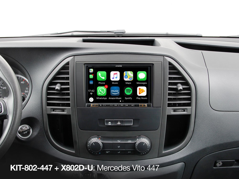 Инсталационен комплект (8") за модел Mercedes Vito (447) 2014 и по-нови. Този комплект се доставя със всички необходими инсталационни части, като адаптер за USB / AUX порт, кабелен сноп, интерфейс за CAN шината, монтажни скоби, антенно захранващ адаптер с фантомно захранване, захранващ адаптер quadlock и декоративен панел. Това значително улеснява инсталацията и позволява използването на бутоните на волана и информационния дисплей на автомобила с вашия продукт Alpine. KIT-802-447 в комбинация с X803DC-U / X803D-U / X802DC-U / X802D-U предлага първокласна навигация включително насочване стъпка по стъпка на мултифункционалния дисплей, съчетано със съвместимост DAB+, Android Auto и Apple CarPlay.