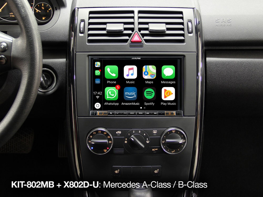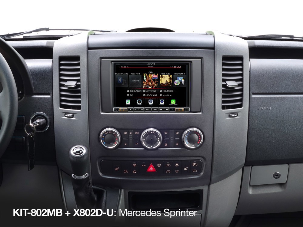 Този комплект се доставя със всички необходими инсталационни части, като кабелен сноп, интерфейс за CAN шината, монтажни скоби, антенно захранващ адаптер с фантомно захранване, захранващ адаптер quadlock и декоративен панел. Това значително улеснява инсталацията и позволява използването на бутоните на волана и информационния дисплей на автомобила с вашия продукт Alpine. KIT-802-MB в комбинация с новите X803DC-U / X803D-U / X802DC-U / X802D-U предлага първокласна навигация включително насочване стъпка по стъпка на мултифункционалния дисплей, съчетано със съвместимост DAB+, Android Auto и Apple CarPlay.