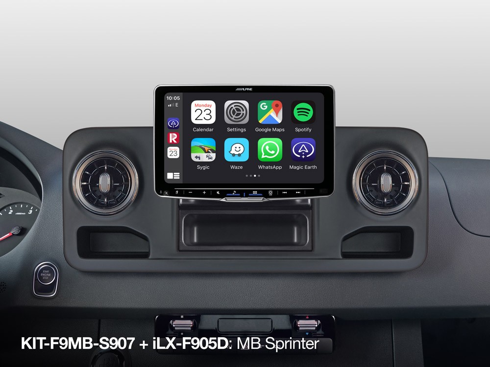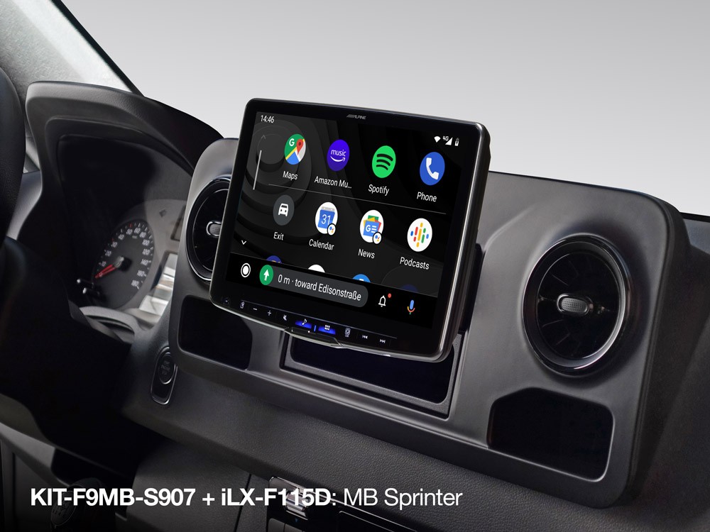 Този инсталационен комплект позволява лесен и чист монтаж на Alpine Halo11 (iLX-F115D), Halo9 (iLX-F905D, iLX-F903D) или Alpine Halo9 Navi (INE-F904D / INE-F904DC) в Mercedes Sprinter 907 (VS 30) от моделната 2018 г. KIT-F9MB-S907 включва специално изработена рамка, кабелен пакет с CAN интерфейс и антенно адаптер. Този комплект е съвместим със Sprinter-и с 1 DIN радио (E1D); превозни средства с подготовка за радио (ER0) се нуждаят допълнително от адаптер KWE-S907.