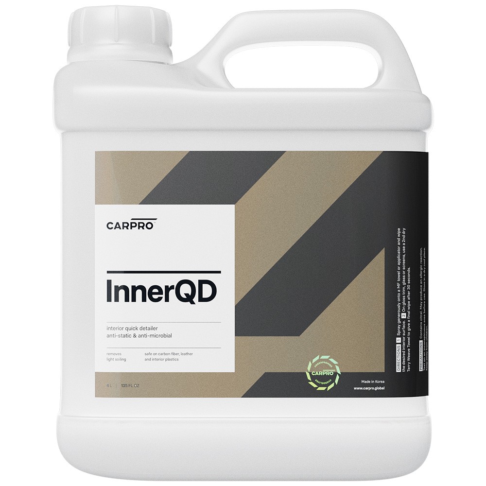 CarPro InnerQD е бърз интериорен детайлер, който е антистатичен и антимикробен - спрей за детайли в интериора. Може да се използва върху всички вътрешни повърхности за почистване на леки замърсявания, отпечатъци от пръсти, прах и за премахване на електростатичното прилепване на прахови частици, както и за ограничаване растежа на патогенни микроорганизми. Съставът на InnerQD е проектиран да оставя сух, сатенен и антистатичен слой без ивици, който предотвратява повторното отлагане на прах.Основни характеристики