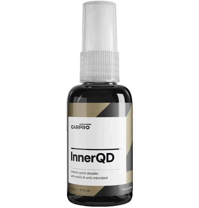 CarPro InnerQD е бърз интериорен детайлер, който е антистатичен и антимикробен - спрей за детайли в интериора. Може да се използва на всички вътрешни повърхности за почистване на леки замърсявания, отпечатъци от пръсти, прах и за премахване на електростатичното прилепване на прахови частици, както и потискане на растежа на патогенни микроорганизми. Формулата на InnerQD е създадена да оставя сух, сатенен и антистатичен слой без следи, който предотвратява последващо отлагане на прах.Основни характеристики