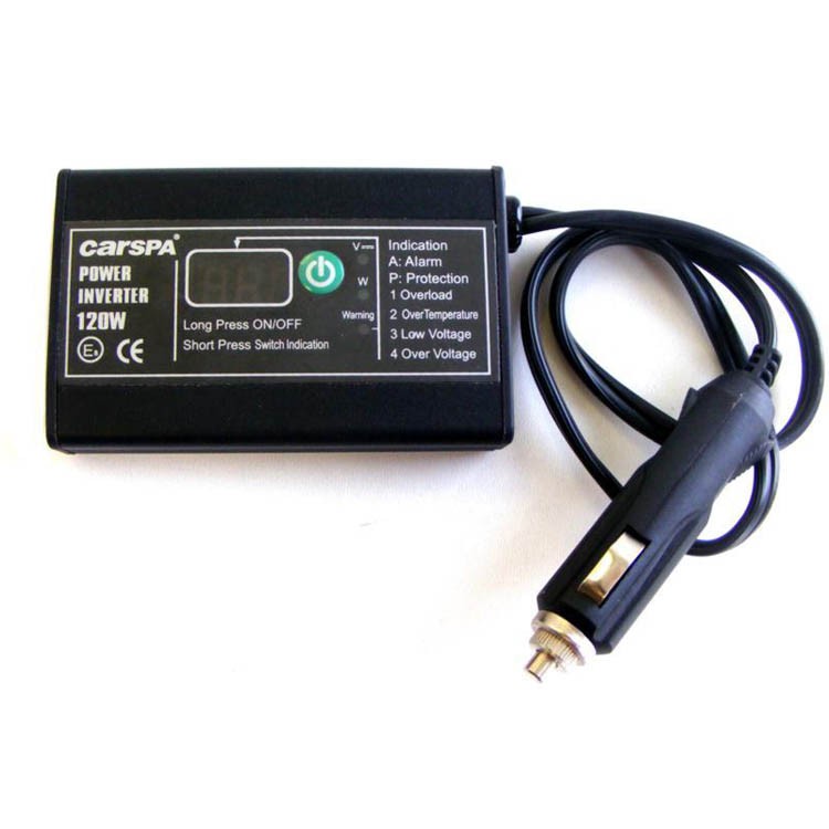 Компактен лек инвертор с мощност 120W е подходящ за използване на малки уреди на 230V на място без достъп до електрическата мрежа.