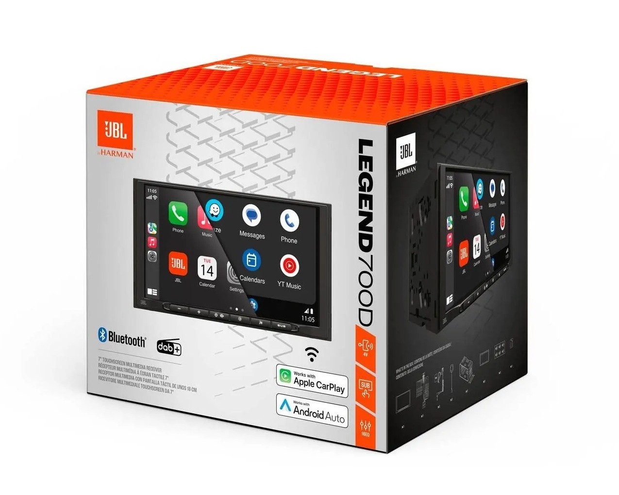 JBL Legend 700D е 2DIN мултимедийно автомобилно радио с 7” капацитивен тъч дисплей, проектирано като модерно контролно център на аудио системата в превозното средство. То предлага пълна интеграция на смартфон чрез Wireless Apple CarPlay и Android Auto, което дава на водача директен достъп до навигация, музика, съобщения и телефонни разговори без необходимост от физическа кабелна връзка. Радиото поддържа широк спектър от източници на сигнал, включително Bluetooth 5.0, USB вход, AUX вход и AM/FM тунер. Bluetooth позволява безжично стриймване на музика и handsfree разговори с поддръжка на телефонен указател и показване на информация за песните. Тъч управлението в комбинация с интуитивен интерфейс осигурява комфортна експлоатация по време на шофиране. Шестканалните линейни RCA изходи с напрежение 4 V (предни, задни, субуфер) позволяват директно и качествено свързване на външни усилватели и активни субуфери. Вграденото управление на субуфера позволява бърза корекция на нивото на басовата компонента директно от предния панел без нужда от намеса в настройките на усилвателя. В комплектацията е включен и 16-лентов еквалайзер с времево изравняване, който позволява детайлно адаптиране на звука към акустичните условия на конкретното превозно средство и разположението на говорителите. Вътрешният усилвател с максимална мощност 4 × 50 W е подходящ за директно захранване на говорителите, като системата може по всяко време да бъде разширена с външни усилватели за по-голяма мощност и контрол върху звука. Моделът JBL Legend 700D допълнително разполага с вграден цифров тунер DAB/DAB+, който позволява прием на дигитално радиопредаване с по-високо качество на звука, по-стабилен сигнал и по-широк избор от станции в сравнение с класическия FM обхват.
