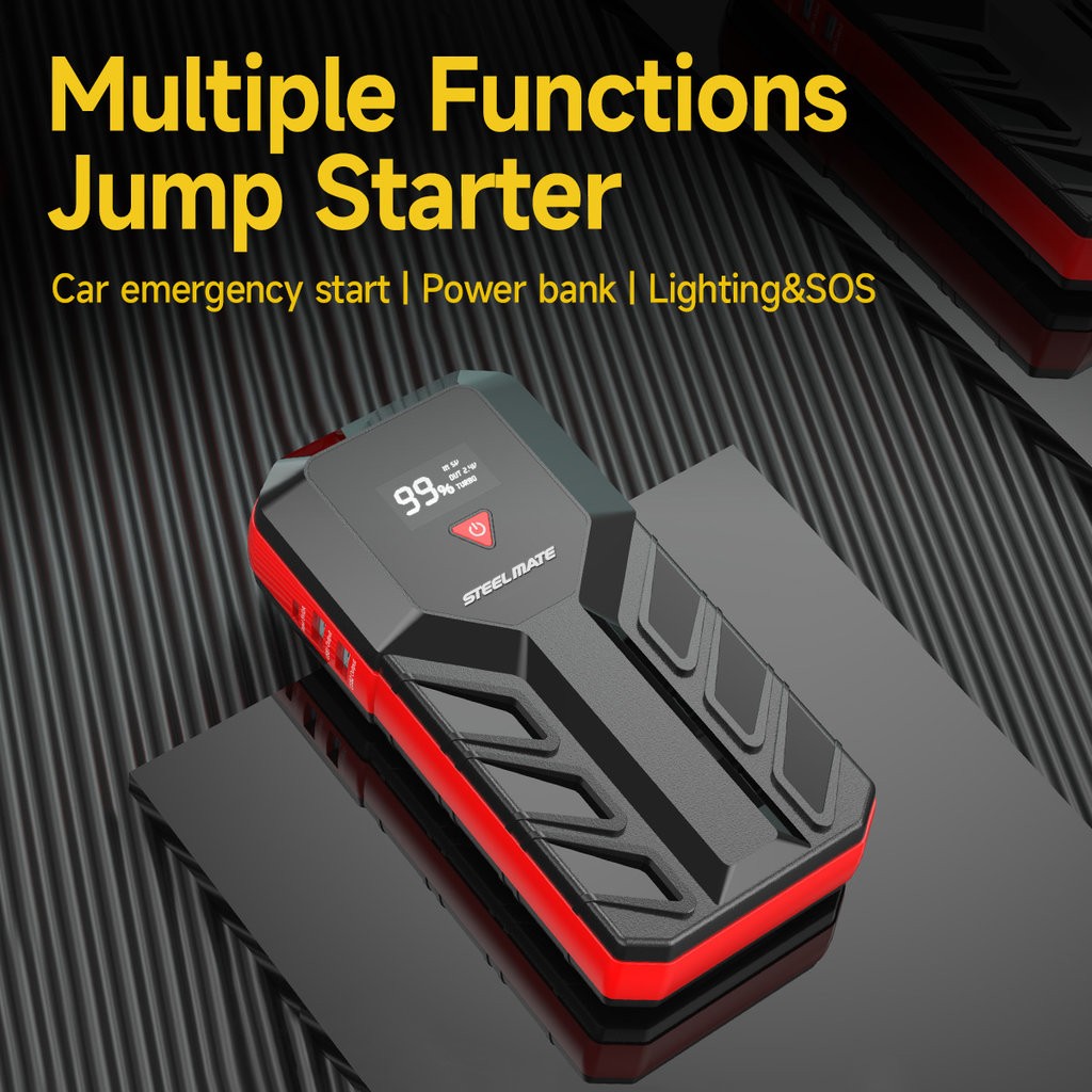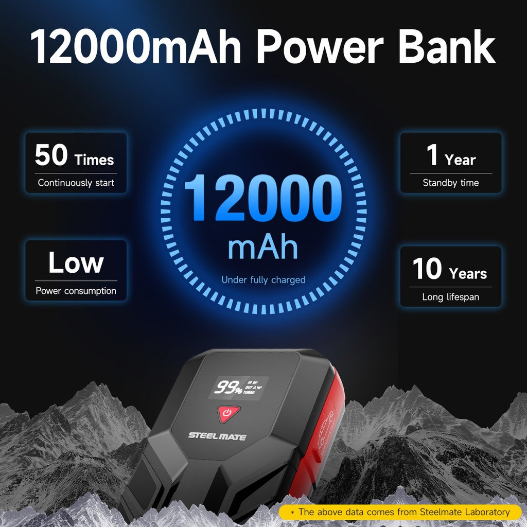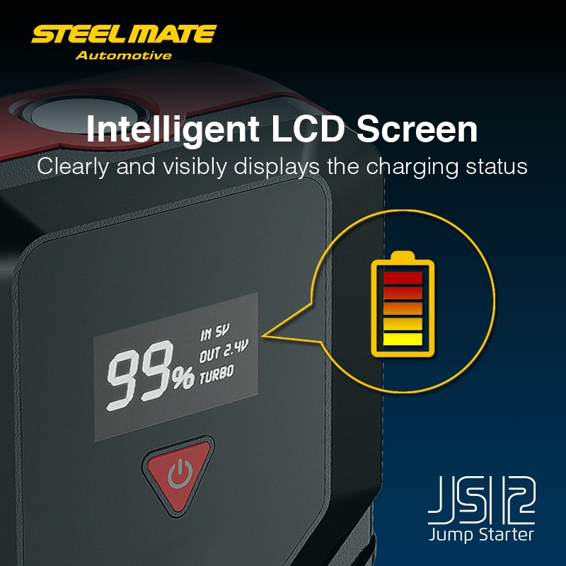 Компактен комплект за стартиране с капацитет 12.000 mAh от Steelmate ще помогне да стартирате превозното средство и освен това служи като powerbank за USB зареждане или като преносима LED лампа. Jump starter-ът разполага с ясен LCD дисплей, който показва текущото работно състояние.
