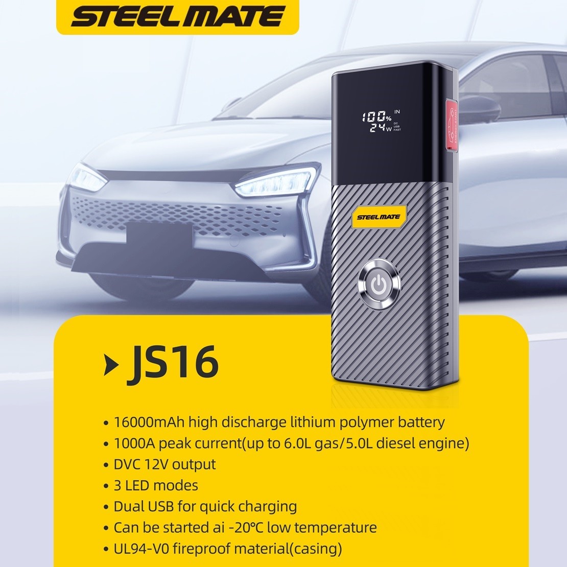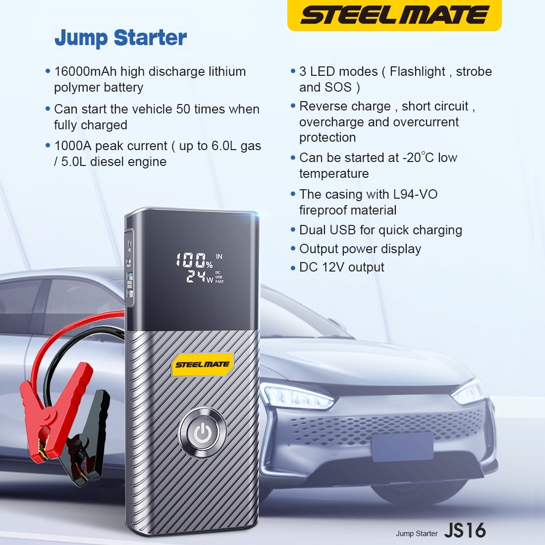 Комплект за стартиране с капацитет 16.000 mAh от Steelmate помага за стартиране на превозното средство и освен това служи като powerbank за USB зареждане или като преносима LED лампа. Jump starter-ът разполага с ясен LCD дисплей, който показва текущото работно състояние.
