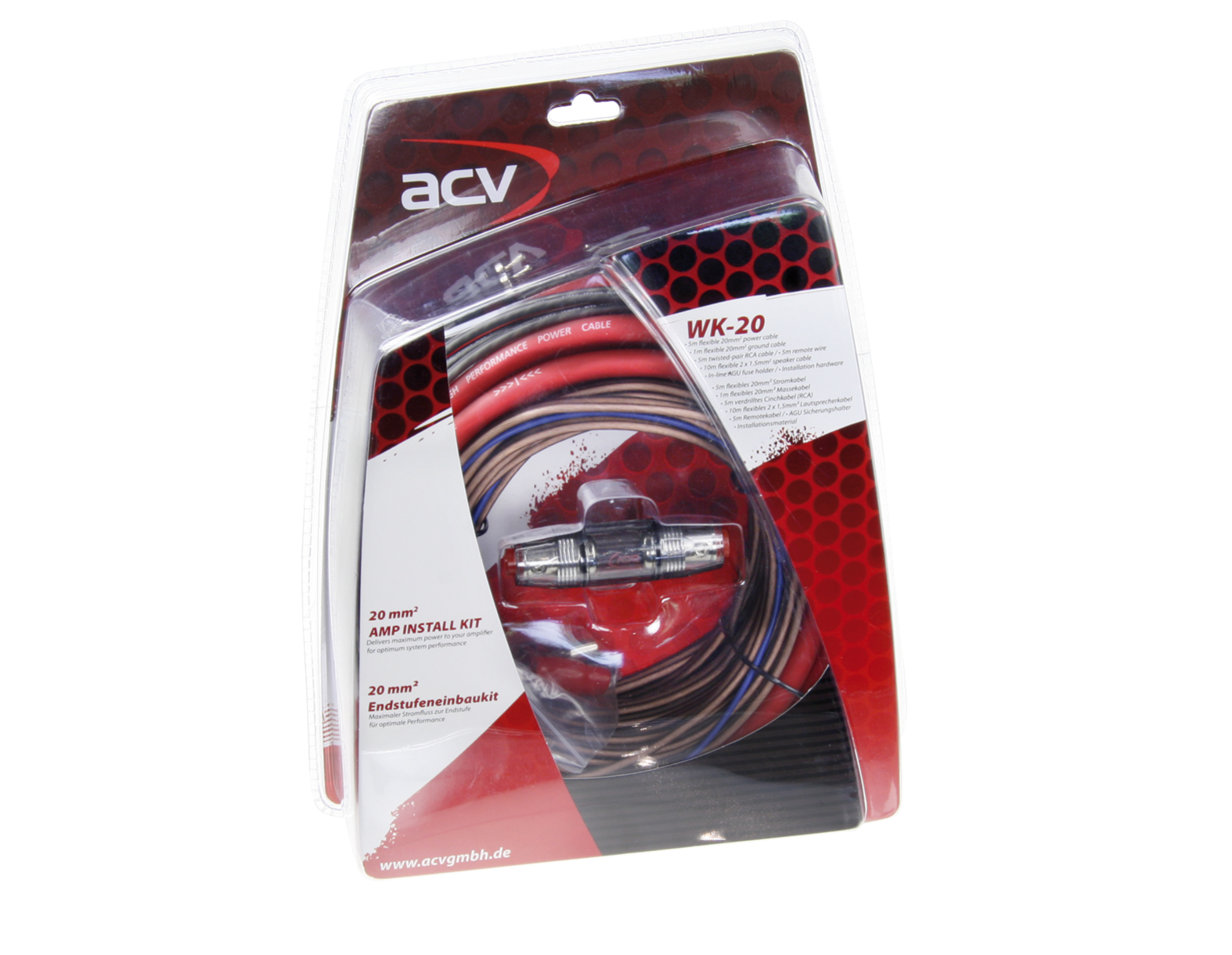 Кабелният комплект ACV WK-20 е качествен инсталационен кит, проектиран за автомобилни аудио системи с мощност до 900 W RMS. Идеален е за инсталиране на по-мощен двуканален усилвател. Предимство са медните захранващи кабели.