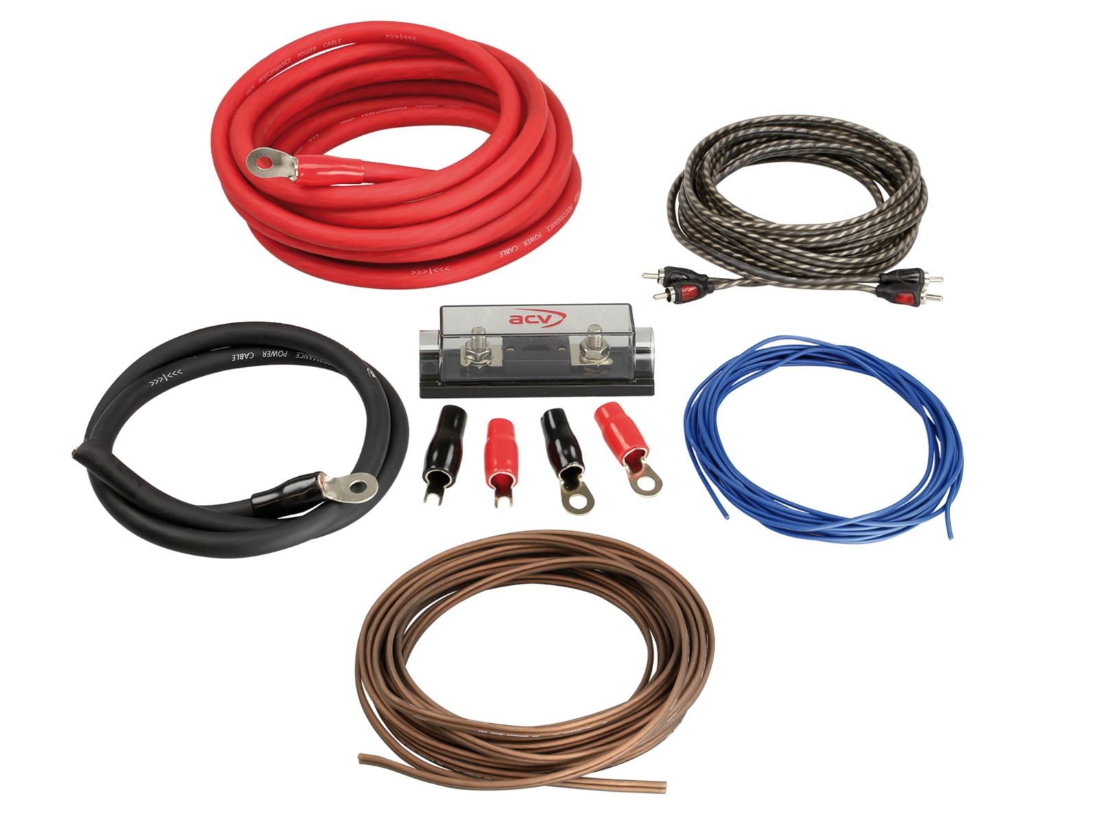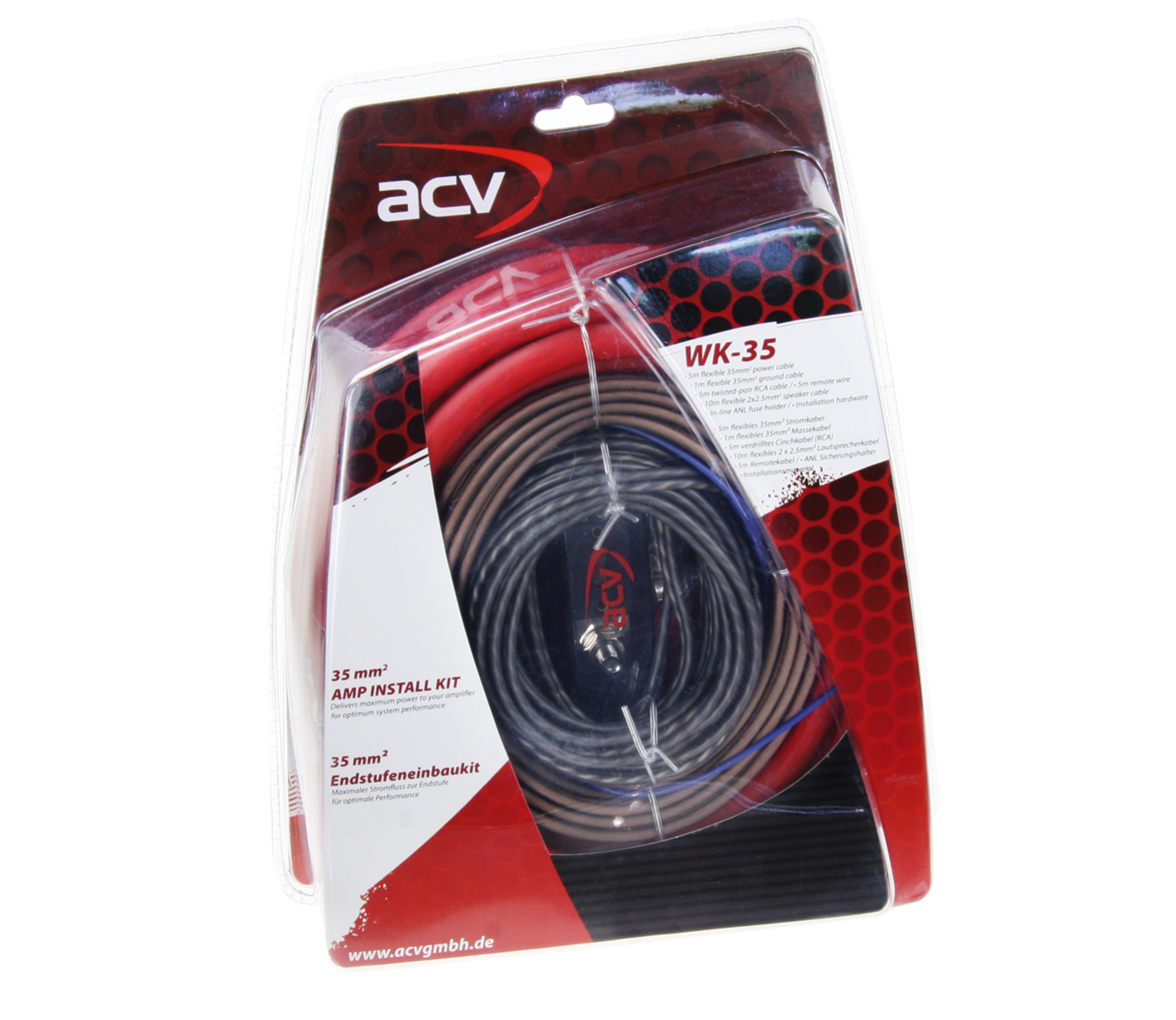 Кабелният комплект ACV WK-35 е качествен инсталационен кит, проектиран за автомобилни аудио системи с мощност до 1600 W RMS. Идеален е за инсталиране на мощен двуканален усилвател. Предимство са медните захранващи кабели.