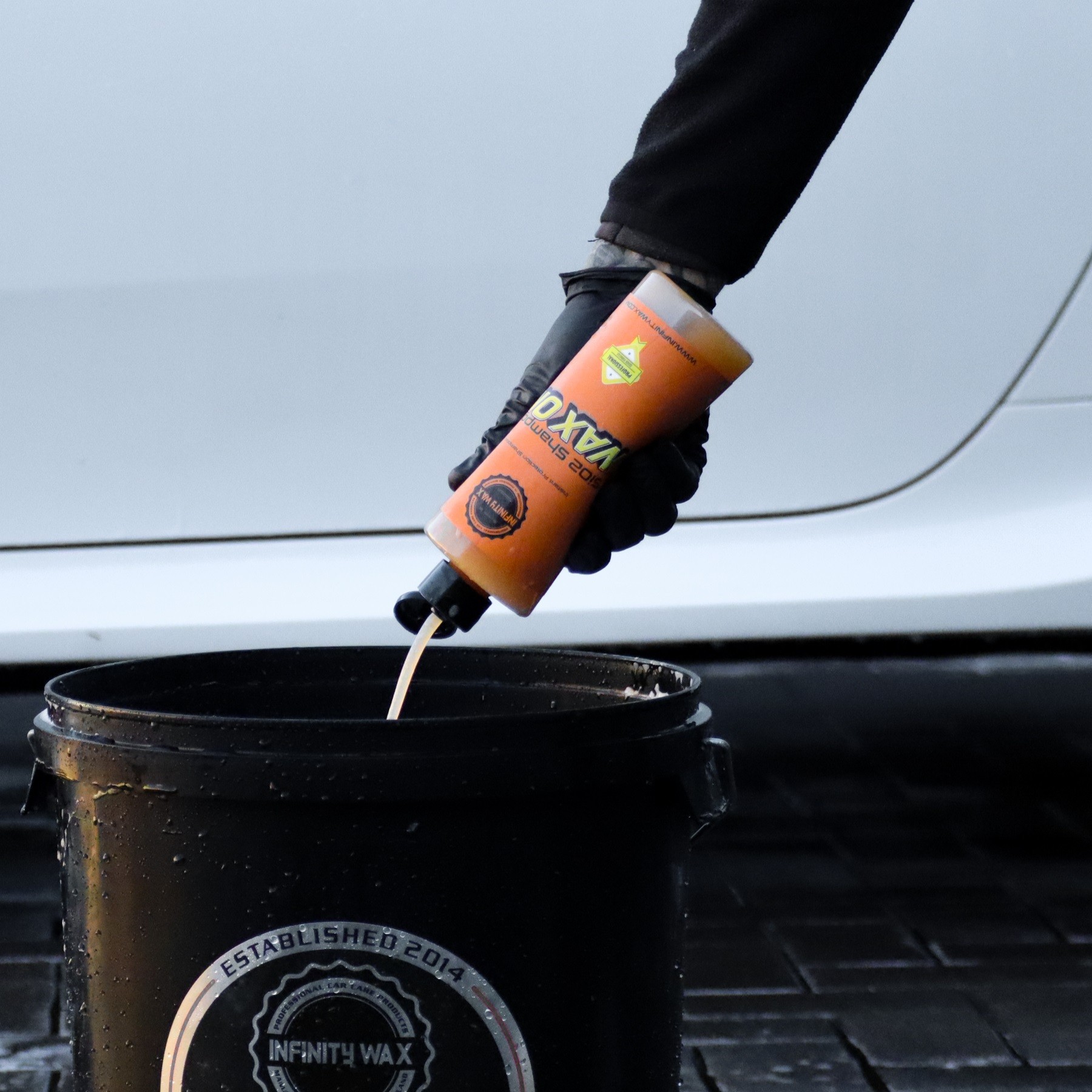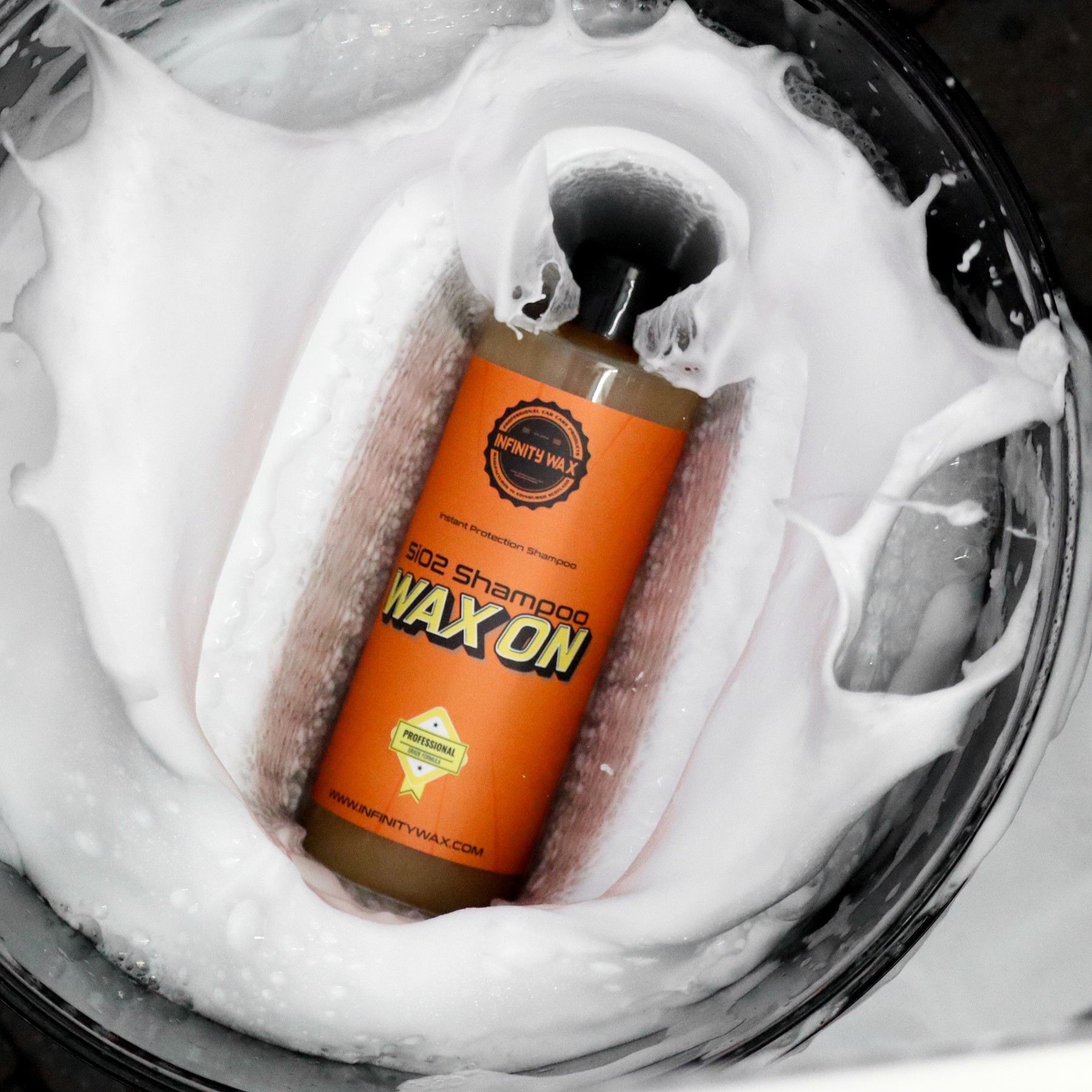 Infinity Wax - WAX ON Shampoo е първият керамичен шампоан от Infinity Wax с аромат на портокаловата напитка Fanta, осигурява гъста пяна и защита благодарение на силициев диоксид SiO2. Този шампоан допълнително предлага удивителни хидрофобни свойства, без да е необходимо да прилагате допълнителна отделна защита. Просто измийте автомобила с този шампоан както обикновено и очаквайте при дъжд да виждате върху каросерията само впечатляващи "перли". WAX ON съдържа меки, pH неутрални повърхностно активни вещества, произведени от захарна тръстика, поради което продуктът е напълно устойчив, но същевременно нежен към автомобила и към кожата на потребителя. Шампоанът съдържа силна смола-емулсия SiO2. Тя придава на дори най-пренебрегвания лак невероятен блясък и същевременно осигурява защита срещу замърсявания. WAX ON ви позволява лесно да измиете превозното средство и същевременно да добавите защита. Това е, разбира се, спестяване на време, но и надежден начин за поддържане на автомобила през по-хладните месеци. WAX ON обикновено има трайност няколко седмици, преди защитата да отмине, така че можете да се доверите на неговото действие.