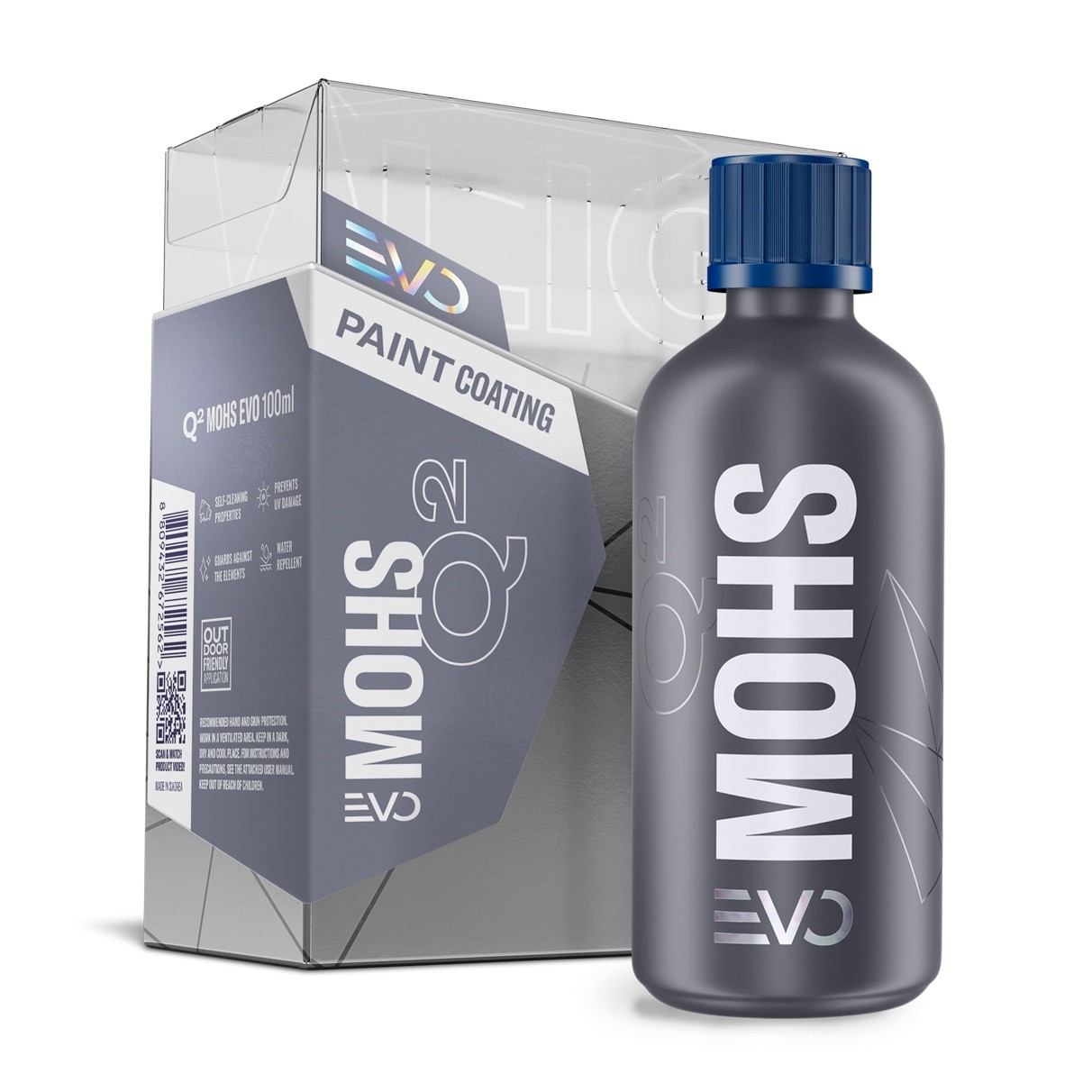Gyeon Q² Mohs EVO е легендарно, преродено керамично покритие, което е напълно преработено и сега представлява световно първото керамично покритие с използване на технологията флуорно модифицирана полисилазановa формулация в автомобилната индустрия. Модификацията на полисилазаните в прекурсорните фази носи огромни предимства на всички нива - дълготрайност, изключителна химическа устойчивост и изумително лесна апликация. Екстремен блясък и хидрофобност са само добавена стойност. Оригиналното покритие Q² Mohs беше известно като многослойно покритие, но версията Q² Mohs EVO променя всичко! Новата версия EVO позволява проста и много директна апликация само с един слой. Благодарение на един слой и използването на новия микрофибърен апликатор на Gyeon, разходът спадна. Докато преди разходът беше минимум 50 ml, с версията EVO ви стигат само 25 до 30 ml, с по-добра производителност. Всички нови керамични защити EVO от Gyeon могат да се нанасят навън, разбира се при идеални условия като сухо, относително безветрие и сянка.Основни характеристики