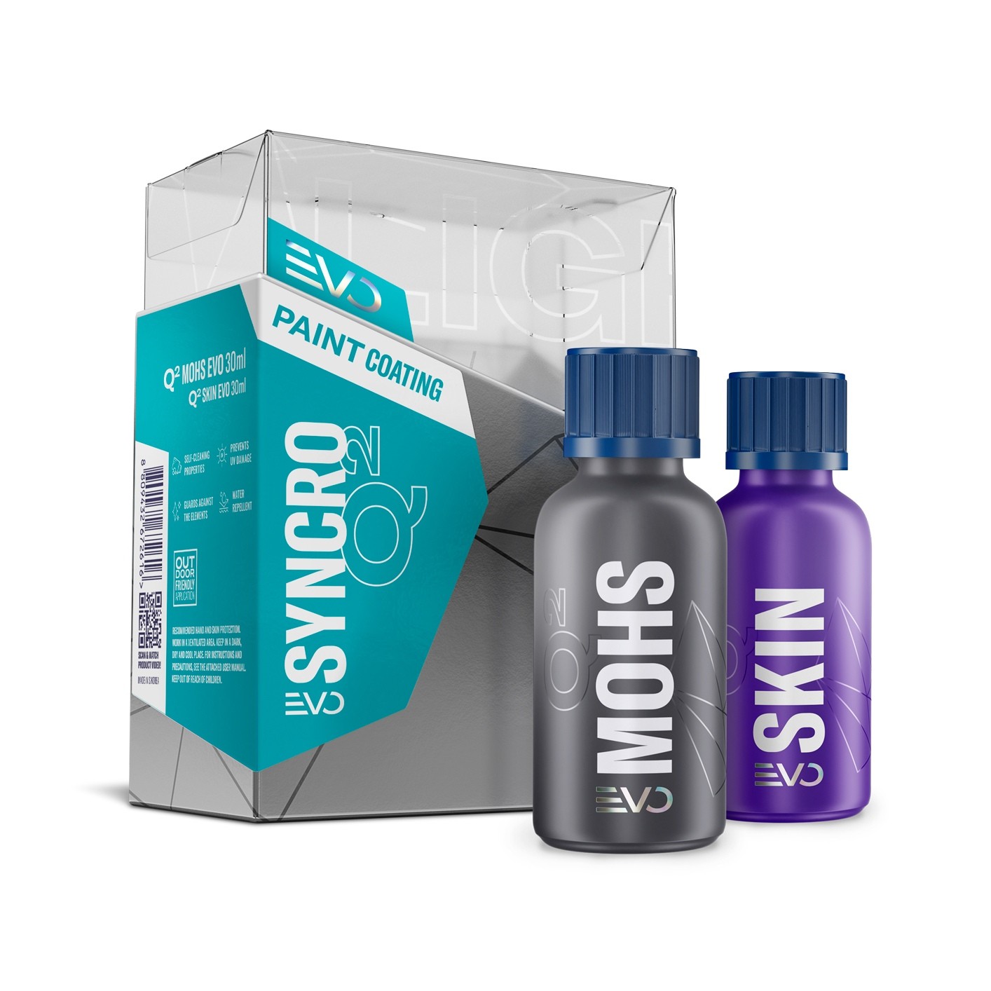 Комплектът Gyeon Q² Syncro EVO е т.нар. "втора кожа" за лака на вашия автомобил. Това е усъвършенстван, двустепенен комплект керамични покрития от ново поколение, който се състои от керамичното покритие Gyeon Q² Mohs EVO и Gyeon Q² Skin EVO. Gyeon Q² Mohs EVO е легендарното, възродено керамично покритие, което бе разработено от основи и вече представлява първото в света автомобилно керамично покритие с използване на технология с флуорно модифицирана полисилaзанова формула. Модификацията на полисилaзаните в прекурсорните фази носи огромни предимства на всички нива - дълготрайност, химическа устойчивост и лесно нанасяне, което е удивително просто, а въпреки това защитата е изключително химически устойчива. Gyeon Q² Skin EVO е горният слой, който значително повишава блясъка, цветопредаването на тъмните цветове и устойчивостта на хидрофобния ефект. Всички нови EVO керамични защити от Gyeon могат да се нанасят навън, разбира се при идеални условия като сухо време, относително безветрие и сянка.Основни характеристики