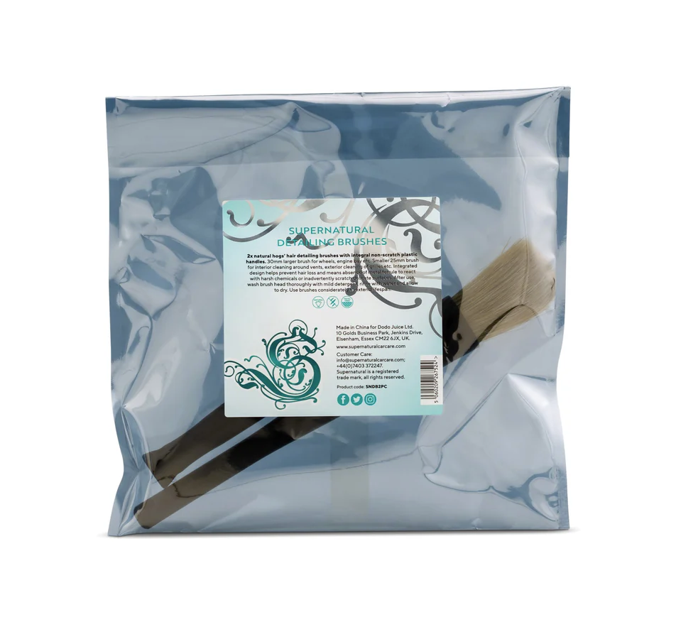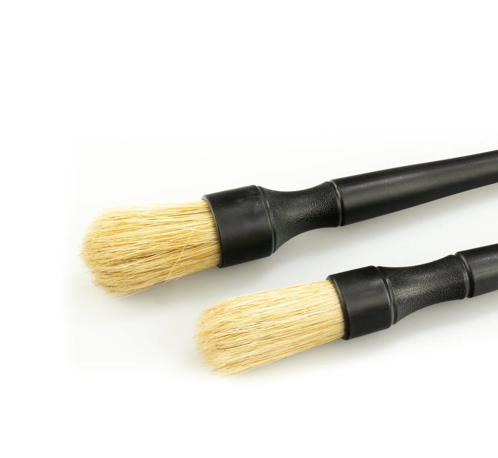 Четките Supernatural са отлични за работа с детайли, тъй като имат по-мека, естествена четина и в сравнение с алтернативите от синтетичен найлон, те все пак са достатъчно твърди, за да почистват повърхностите старателно, ефективно и бързо. По принцип можете да използвате тези четки за джанти, пластмасови решетки и в двигателния отсек, но можете да решите да ги използвате и за почистване на вентилационни отвори и фуги на облицовките в интериора на автомобила. Дръжките на четките са изработени от едно цяло пластмасово парче. Това не само предотвратява загубата на четина, но и увеличава живота на четките, тъй като скобата не може да се спука. И тъй като няма метално пръстенче, тя не може да надраска деликатни повърхности или да се заклещи в спиците на джантата. Комплектът съдържа две четки. По-малката четка с диаметър 25 mm е отлична за употреба в интериора (ъглите на таблото, въздуховодите, облицовките, превключвателите и т.н.) или за по-прецизни външни работи (емблеми, алуминиеви джанти). По-голямата четка с диаметър 30 mm е идеалният размер за общо почистване на джанти, по-големи външни въздуховоди и решетки, детайли в моторния отсек, почистване на резервоара и др.