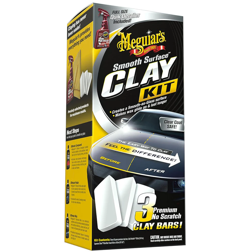 Meguiar’s Smooth Surface Clay Kit е професионално разработен комплект за деконтаминация на лакирани повърхности на автомобила. Съдържа всичко необходимо за безопасно отстраняване на свързани повърхностни контаминанти, които обикновеното измиване не премахва. С помощта на специални блокчета - clays, детайлиращ лубрикант и микрофибърна кърпа можете да постигнете напълно гладка повърхност на лака, подготвена за нанасяне на допълнителни защитни слоеве като восък или sealant. Резултатът е повърхност с по-добро отражение, по-висок блясък и по-дълготрайна защита.