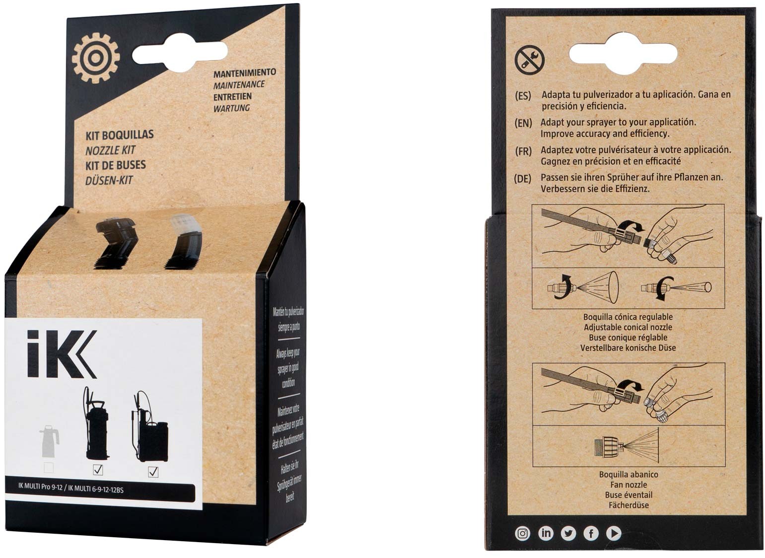 IK MULTI 6-9-12-12BS / PRO 9-12 nozzle kit е комплект резервни дюзи, предназначен за налягани пръскачки IK MULTI PRO 9 и IK MULTI PRO 12. Позволява избор между регулируем кух конус с променлива ширина на разпръскване и дюза, създаваща фина мъгла. Благодарение на това лесно може да се адаптира моделът на пръскане според типа на използвания химикал, желаната големина на капката или площта, която трябва да се обработи. Правилният избор на дюза повишава ефективността на работата и осигурява прецизни резултати.