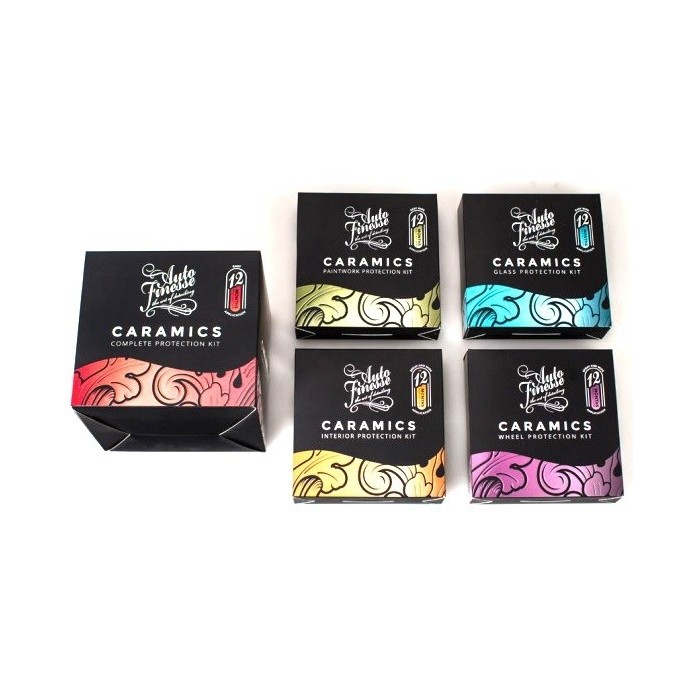 Дълготрайна защита и блясък за цялото превозно средство с трайност 12 месеца. Caramics са керамични покрития, които се свързват с повърхностите и по този начин предлагат първокласна механична защита, ускоряват оттичането на вода и замърсявания и улесняват последващото почистване и миене. С линията Caramics Auto Finesse става пионер в леснотата на нанасяне и ефективността при съхранение. Като първи в света тя не предлага защитата в класическите малки шишенца с течност, които обикновено трябва да се използват незабавно, защото след време кристализират. Caramics Paintwork и Glass Coating ще намерите напоени в кърпи и херметически запечатани в няколко пликчета. Защитата така остава по-дълго в 100% състояние. Продуктите Caramics можете лесно да съхранявате и използвате за последващи корекции, ремонти или например за третиране на друг автомобил, дори след няколко месеца или години. Caramics Coating са насочени към необичайно лесно приложение, което всеки може да извърши. Няма проблем с нанасянето, няма дълго триене. Благодарение на напоените кърпи отпада и тревогата за прекомерна консумация. Caramics Kit не съдържа само самите покрития, но и всички необходими препарати за подготовка и избърсване. Освен това включва и защитни аксесоари, като нитрилни ръкавици и др.
