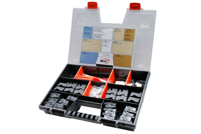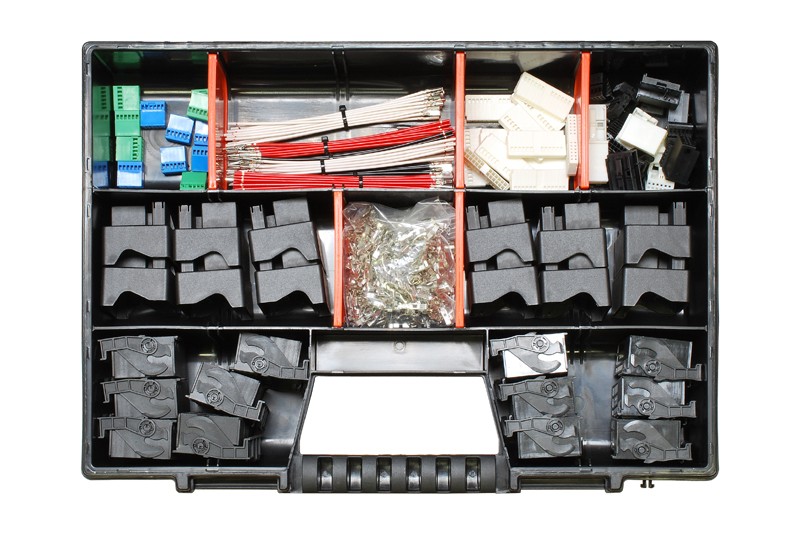 Комплект конектори FAKRA (MOST) за инсталиране на автомобилни радиа в подредено оформление в пластмасова кутия.