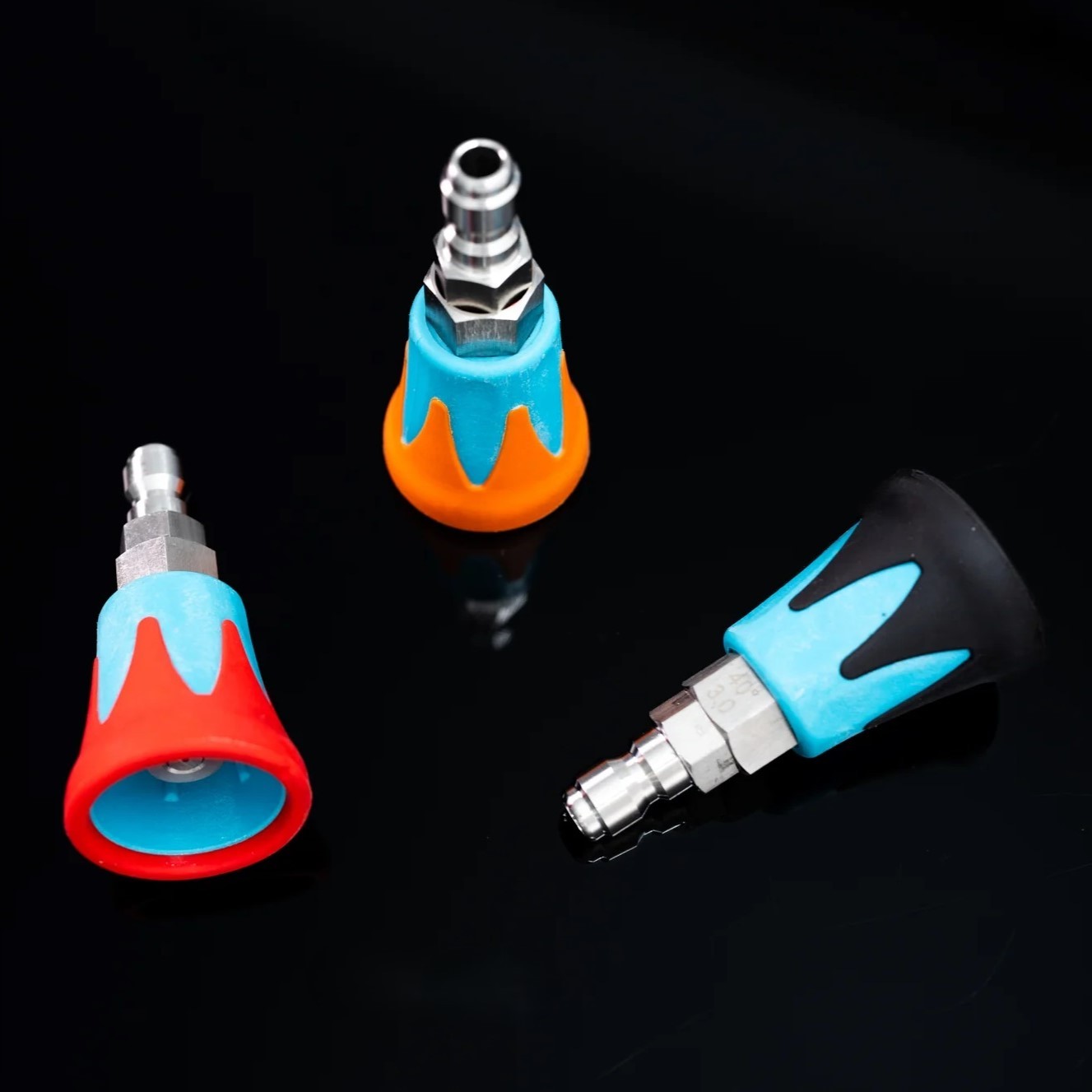 Премиум разпръскващите дюзи са изработени от неръждаема стомана 304, здрав метал с професионално качество, който издържа при интензивна ежедневна употреба. Гумен притежател на дюзата е мек на допир и в него е вграденa неръждаема дюза. Това предотвратява металните части да влизат в контакт с каросерията по време на употреба. Прецизната конструкция осигурява перфектно захващане на бързосвързващото съединение без изтичания или риск от повреда на автомобила. За разлика от други стандартни дюзи на пазара, Carbon Collective произвеждат два размера дюзи, което гарантира максимална съвместимост и представяне независимо от това коя водоструйка използвате. Размерът на отвора определя представянето на вашата високонапорна миячка. Уверете се, че поръчвате дюза с правилния размер, за да извлечете максимума от конфигурацията си и да избегнете проблеми с налягането на подаване. (В Обединеното кралство обикновено използват комбинация от марки и оценки на дебита.) Обаче обикновено предлагаме следното като ориентировъчно правило:- Размер на дебита 0,3 - 6 литра в минута и по-малко (домашни водоструйки Kärcher, Nilfisk, Bosch и др.)
