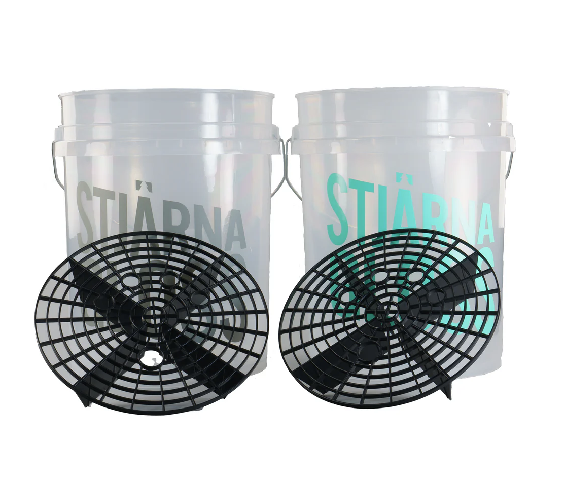 Най-безопасният и най-стилен начин за измиване на автомобила е методът с две кофи (Two bucket method) - по-безопасен начин да измиете автомобила идеално. Този метод идва от Англия и на практика означава, както подсказва името, миене на автомобила с помощта на две кофи за вода. В една кофа има само чиста вода, а в другата вода със шампоан. При миенето изплаквате ръкавицата винаги в кофата с чиста вода и след това я мокрите в кофата със шампоан и продължавате да миете автомобила. Този процес се повтаря непрекъснато, докато автомобилът не е измит. Смисълът на този метод е да остави замърсяванията в първата кофа, благодарение на което във втората кофа остава само чиста вода с шампоан и рискът от надраскване на лака е значително по-нисък. В комплекта Stjärnagloss Twin Bucket Kit with dirt guards ще намерите и качествени защитни решетки, които помагат при миенето да задържат замърсяванията в дъното на кофата, за да не се връщат обратно в миещата ръкавица. В нашата статия "Как безопасно и ефективно да измиете автомобила" ще прочетете всички важни информации, свързани с миенето на вашия автомобил.