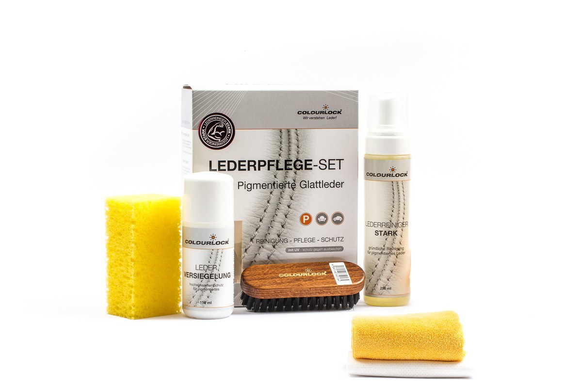 Този комплект комбинира силата на почистващия препарат Lederreiniger Stark (който отстранява дори упорити замърсявания и засъхнали петна) и отличните защитни свойства на Leder Versiegelung. Комплектът е достатъчно ефективен, за да почисти безопасно и старателно дори много замърсена и изтъркана кожа. В същото време е достатъчно нежен, за да запази естествените свойства на кожата. Резултатът е перфектно почистена, поддържана и подхранена кожа.Инструкция за употреба на комплекта Colourlock Glattleder Pflegeset Stark