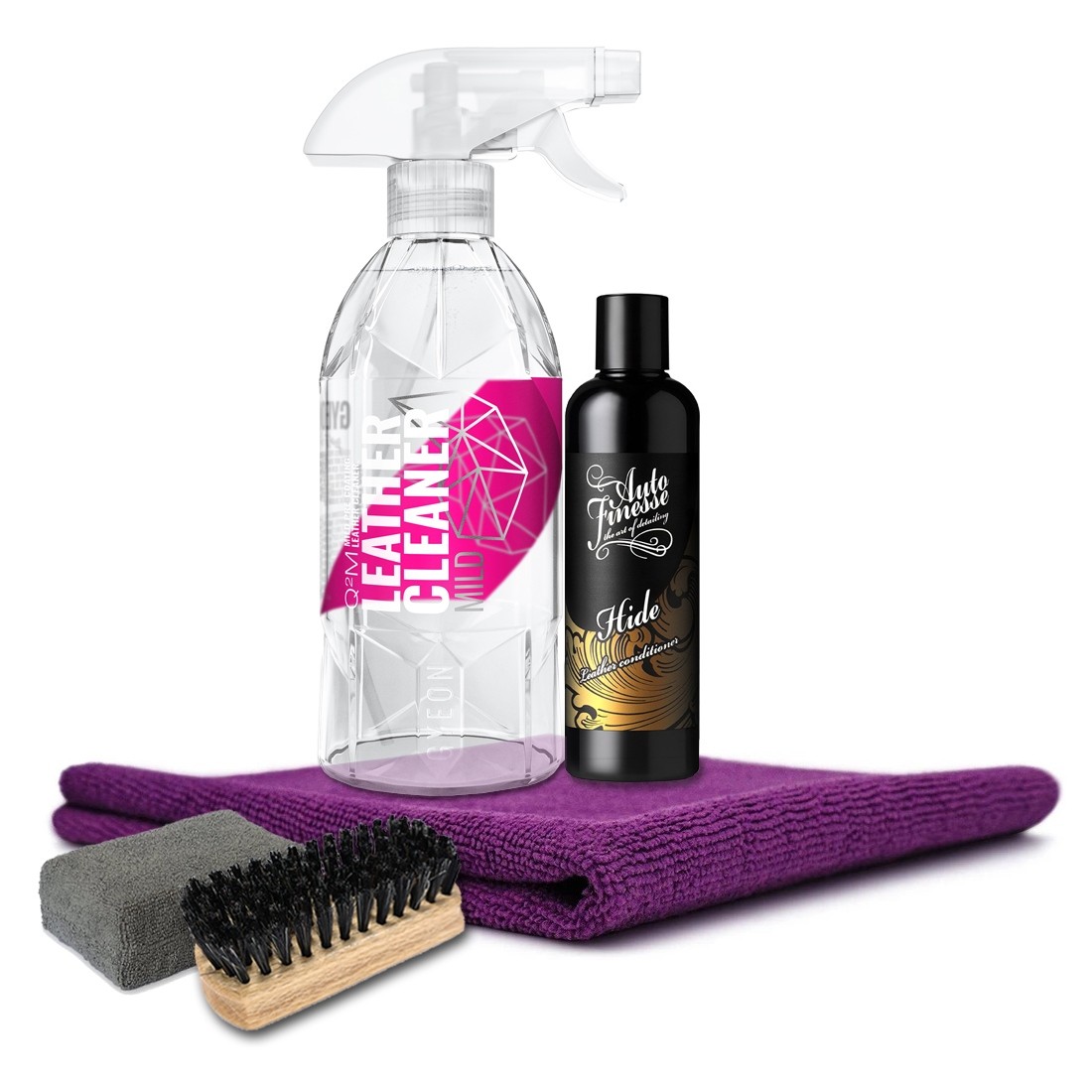 Пълен комплект за почистване и подхранване на кожата в автомобила, който съдържа ефективен, но щадящ почистващ препарат за кожа Gyeon Q2M LeatherCleaner Mild 500 ml и подхранващ препарат за кожа с матов ефект Auto Finesse Hide Leather Conditione с обем 250 ml, включително пълно оборудване. Gyeon LeatherCleaner Mild е препарат за подготовка на кожата преди нанасяне на каквато и да е защита. Премахва леки замърсявания, мазни остатъци и дори оцветявания от дрехи. За разлика от повечето почистващи препарати за кожа, този продукт не съдържа омекотяващи или консервиращи добавки, така че повърхността е готова за нанасяне на какъвто и да е уплътнител или керамична защита. Auto Finesse Hide Leather Conditioner е на восъчна основа и съдържа ланолин. Той предлага две явно важни функции - възстановяване на есенциалните масла, омекотяване и възстановяване на оригиналния цвят; втората функция е да действа като защитна бариера срещу допълнителни повреди и замърсявания. Hide Conditioner създава дишащ слой, който защитава кожата от изсъхване и предотвратява промяна на цвета при светлина. Подходящ е за всички видове кожени повърхности и предлага естествен и матов финиш.Начин на употреба на почиствача Gyeon Q2M LeatherCleaner Mild