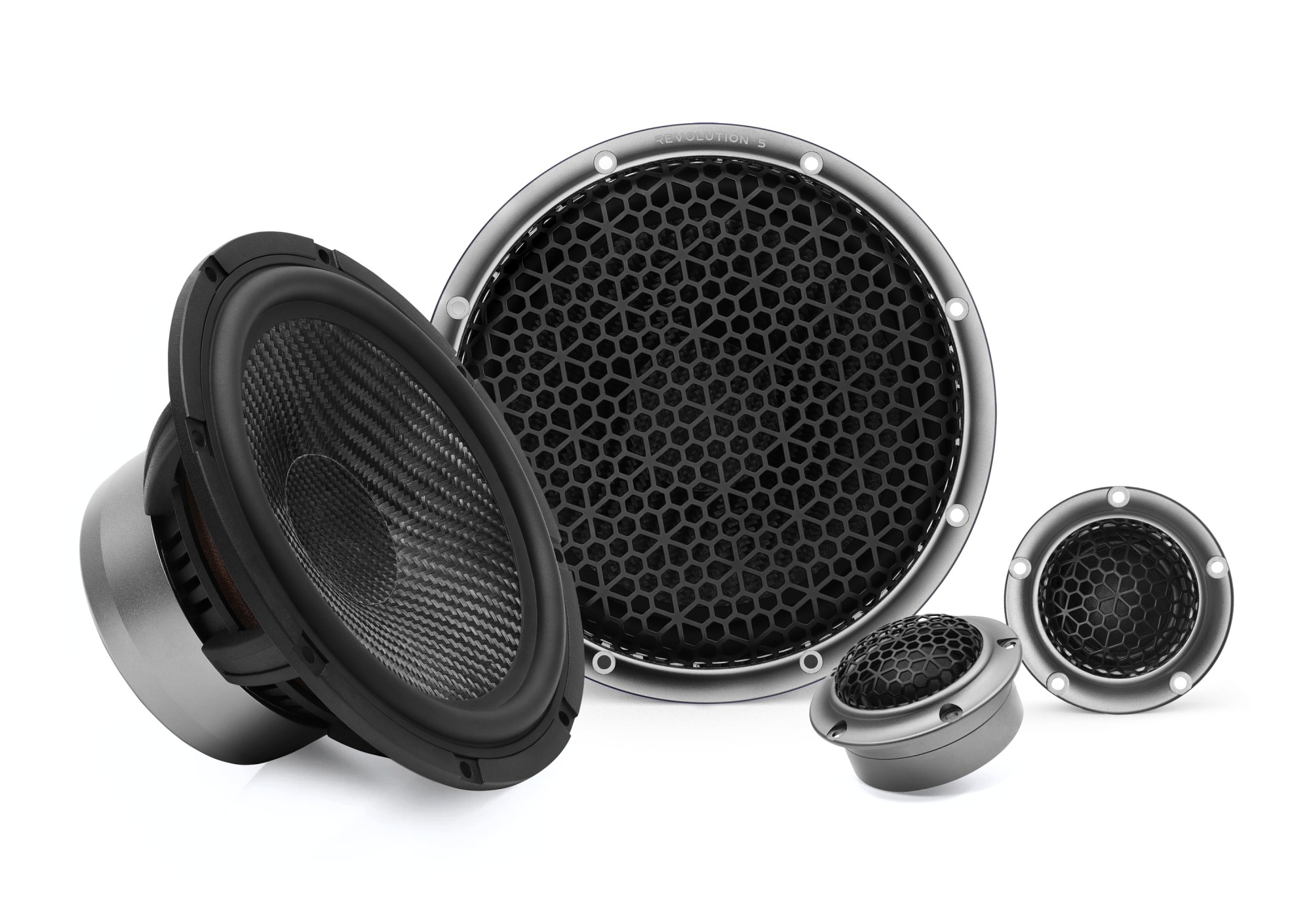Изживейте звукова революция с линията Revolution 5 от Crescendo, създадена с участието на изкуствен интелект. Акцентът върху отличното качество на звука заедно с внимателно подбраните усъвършенствани материали оформят първокласна компонентна система с безпрецедентна чистота на звука. Среднобасовите говорители от серията Revolution 5 разчитат на мотор с високоефективни неодимови магнити и мембрана от стъклени влакна, която придава на звука отлична динамика, прецизност и ясно дефинирани ниски честоти. Високочестотните говорители с 28 mm копринен купол осигуряват вярно възпроизвеждане на високите честоти с детайлност. Всичко е прецизно вградено в здраво алуминиево шаси, което елиминира резонансите и изкривяванията и същевременно придава изключителна естетика. Дизайнът е една от отличителните черти на серията Revolution 5. Алуминий в тъмносиво покритие, специално проектирана решетка за високочестотния и среднобасовия говорител с флорален мотив и мембрана от стъклени влакна заедно с първокласна изработка образуват уникално цяло, което допълва звуковите характеристики на тези говорители.