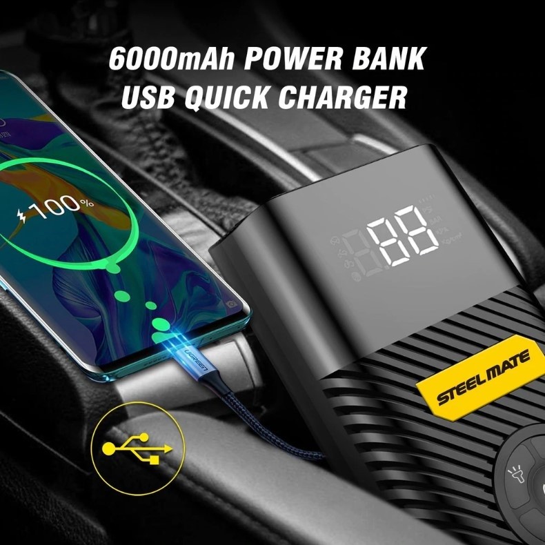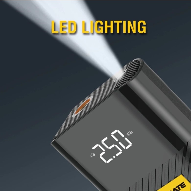 Преносим въздушен компресор с точен цифров дисплей ще ви улесни живота. Повече от просто помпа за гуми, той също така има 6000 mAh батерия за зареждане на устройства и фенер. Бърз и мощен компресор, вградена литиева батерия 6000mAh. Тази автомобилна помпа има максимално налягане 120 PSI (8,3 Bar). Доставя се с 4 адаптера, което я прави идеална за автомобили, RV, мотоциклети, гуми за колела, надуваеми дюшеци, надуваеми лодки, топки и други. Точен LCD цифров манометър за измерване на налягането на гумите в 4 единици и автоматично изключване. Компресорът може да покаже точно налягането в 4 единици (PSI, BAR и KG/CM²). Цифровият LCD дисплей при свързване на маркуча към вентила на гумата точно показва текущото налягане в гумата, така че можете да наблюдавате налягането в реално време. Автоматично спира помпане, когато достигне предварително зададената стойност, което предотвратява препомпване. Дълготрайна LED светлина като аварийно осветление или външен източник на светлина през тъмната нощ. Устройството има 2 режима на LED осветление (режим на светене и режим мигане), които можете да използвате като източник на външно осветление. Това е полезен спътник за аварийна или всекидневна употреба. Преносимо използване и бързо напомпване, може да се използва без външно захранване. Благодарение на това напомпването на гуми при спешен случай е по-лесно и по-удобно. Отличен уред, който можете да вземете със себе си на пътуване с кола, използвайте го винаги, когато имате нуждаТехнически параметри