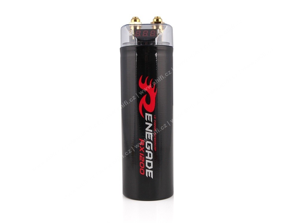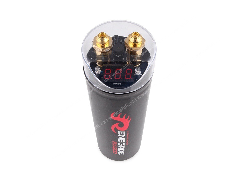 Renegade RX1200 е мощен капацитор (напрежителен кондензатор) с капацитет 1,2 фарада, който служи като бърз енергиен резервоар във вашата car audio система. Предназначен е за ситуации, когато усилвателят или басовата система се нуждаят от краткотрайно висок ток, например при дълбоки басови пикове. Капациторът помага да се стабилизира напрежението, да се намалят спадовете на напрежението и да се минимизират смущенията, което води до по-добра динамика на басите, по-чист звук и по-надеждна работа на цялата система. RX1200 е оборудван с 3-цифрен цифров волтметър, който показва текущото напрежение на системата, и здрави акрилни крепежи за сигурен монтаж. Този капацитор е практична и достъпна инвестиция за собствениците на аудио системи с мощни усилватели или субуфери, при които стандартната електроинсталация на автомобила може да не е достатъчна.