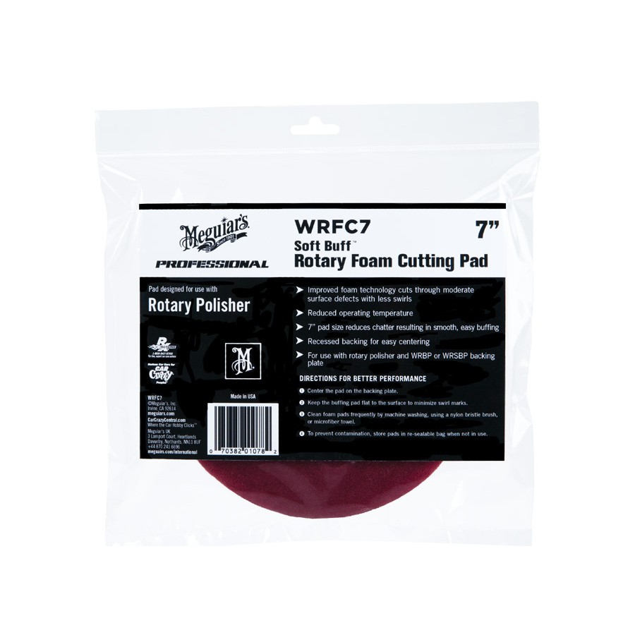 Meguiar’s 7" Soft Buff Rotary Foam Cutting Pad WRFC7 е усъвършенстван пянов диск, предназначен за ротационни полиращи машини и професионална употреба при корекция на лака. Благодарение на подобрената пяна той позволява ефективно отстраняване на средни дефекти по лака, като чести драскотини, лека оксидация или следи от шлайфане, с значително по-нисък риск от образуване на холограми. Диаметърът 7" (~178 mm) допринася за намаляване на „chatter“ ефекта и подобрява стабилността на инструмента при работа. За перфектно центриране дискът е оборудван със запуснат крепеж. WRFC7 е оптимизиран за използване с подходящ носач и е идеалният избор за детайлъри, които изискват висока мощност и контрол при възстановяване на лака.